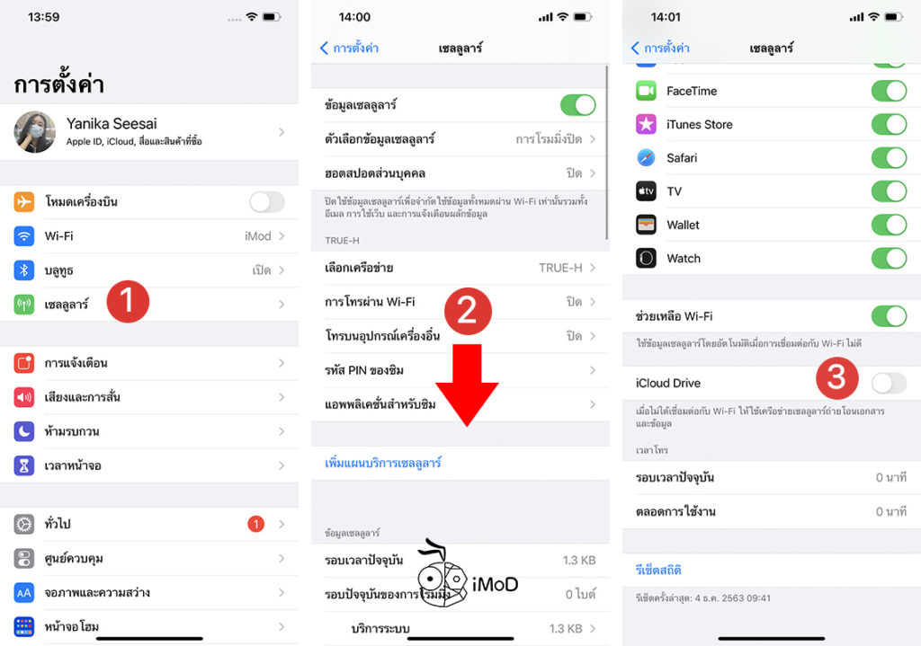 ไปที่ การตั้งค่า (Settings) > เซลลูลาร์ (Cellular) > เลื่อนลง > ปิด iCloud Drive