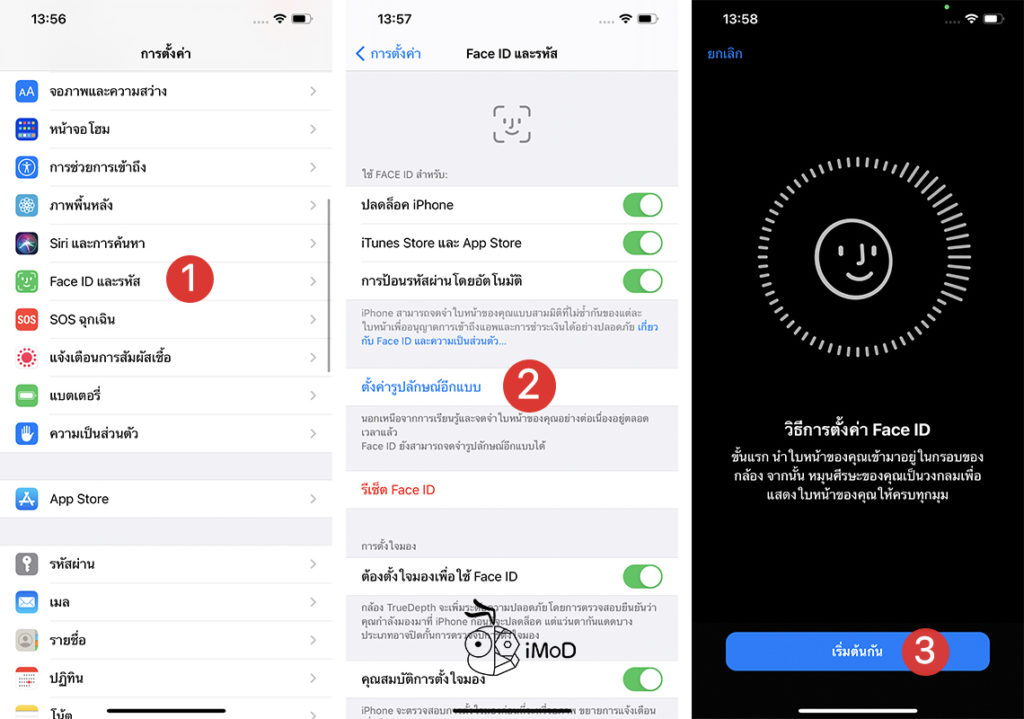 ไปที่ การตั้งค่า (Settings) > Face ID และรหัส (Face ID & Passcode) > ตั้งค่ารูปลักษณ์อีกแบบ (Set up Alternate Appearance) > แล้วก็เริ่มตั้งค่า Face ID ต่อได้เลย