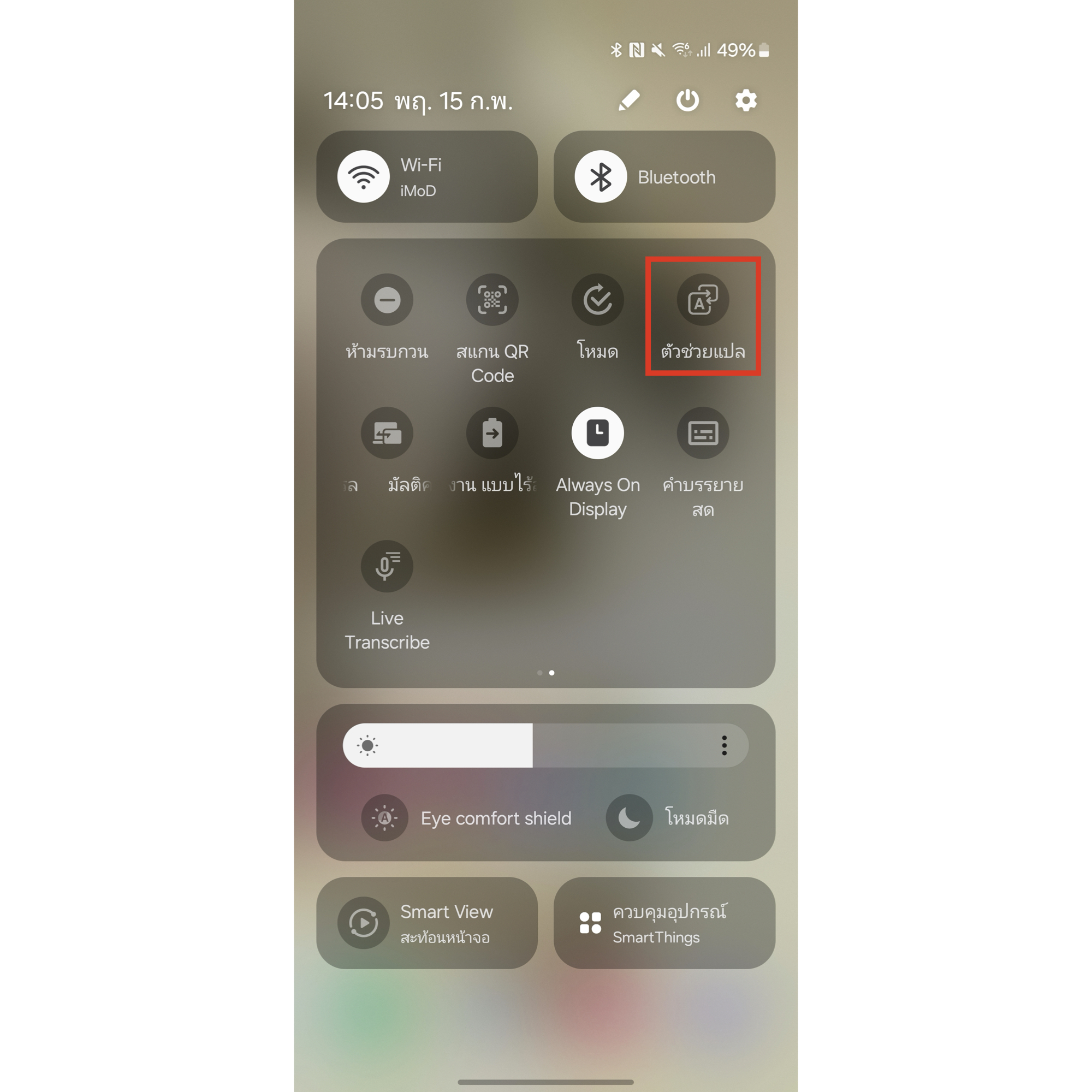 สำหรับวิธีการเรียกใช้งานฟีเจอร์ตัวช่วยแปลภาษา (Interpreter) คือ ปัดแผงด่วนลงมา > เลือก “ตัวช่วยแปล”
