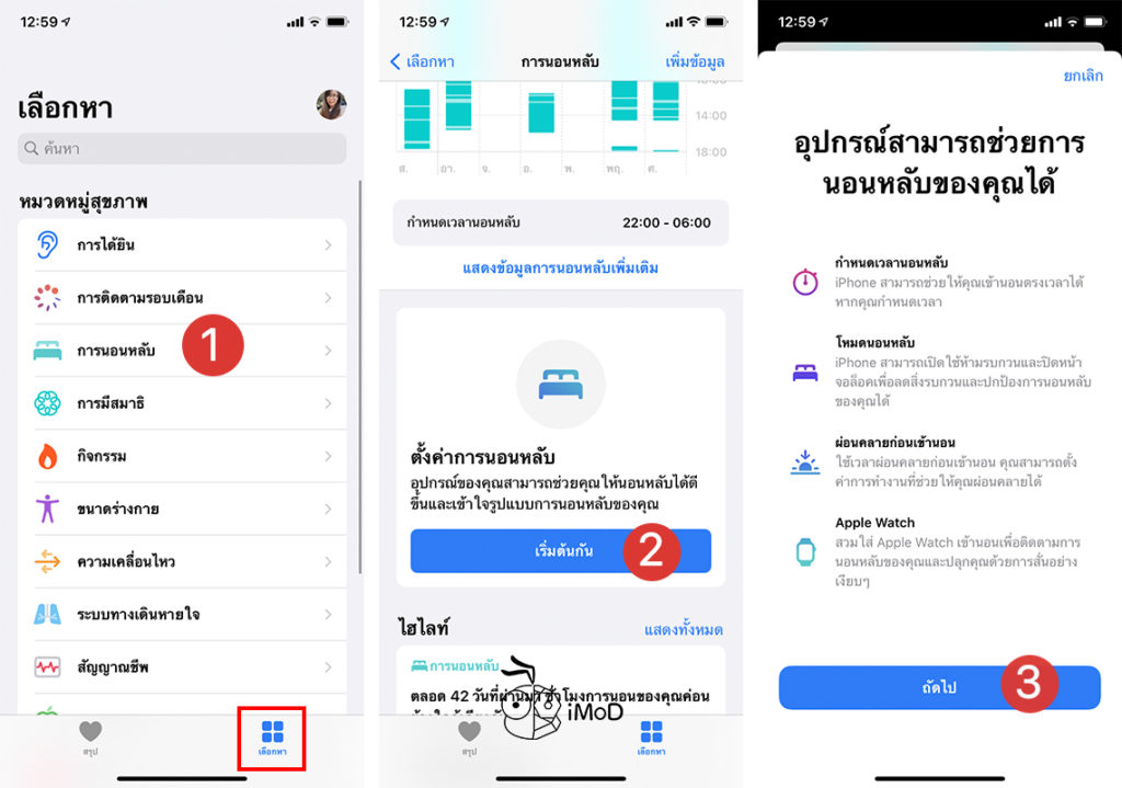 การตั้งค่าการนอนหลับใน iOS 14 นั้นจะตั้งค่าได้ที่ส่วนของแอปสุขภาพ (Health) > แถบเลือกหา ให้แตะการนอนหลับ > เลื่อนลงมาด้านล่างส่วนของ ตั้งค่าการนอนหลับ ให้แตะเริ่มต้นกัน > แตะถัดไป