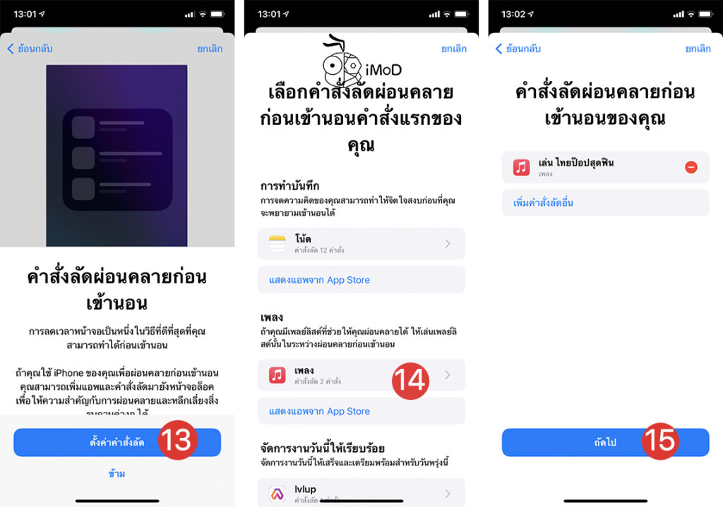 แตะถัดไป > เปิดใช้งานโหมดนอนหลับ > ระบบจะให้เลือกการผ่อนคลายก่อนเข้านอน สามารถกำหนดได้ว่าจะให้มีการผ่อนคลายกี่นาทีก่อนเข้านอน จากนั้นก็แตะ เปิดใช้งานการผ่อนคลายก่อนเข้านอน