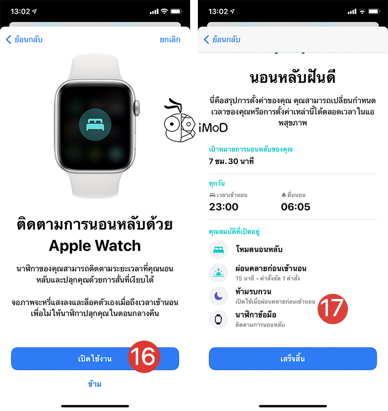 หากผู้ใช้มี Apple Watch ก็สามารถเปิดใช้งานการติดตามการนอนหลับด้วยได้เลย เมื่อนอนหลับก็สวมใส่ Apple Watch นอนด้วย > จากนั้นแตะเสร็จสิ้น