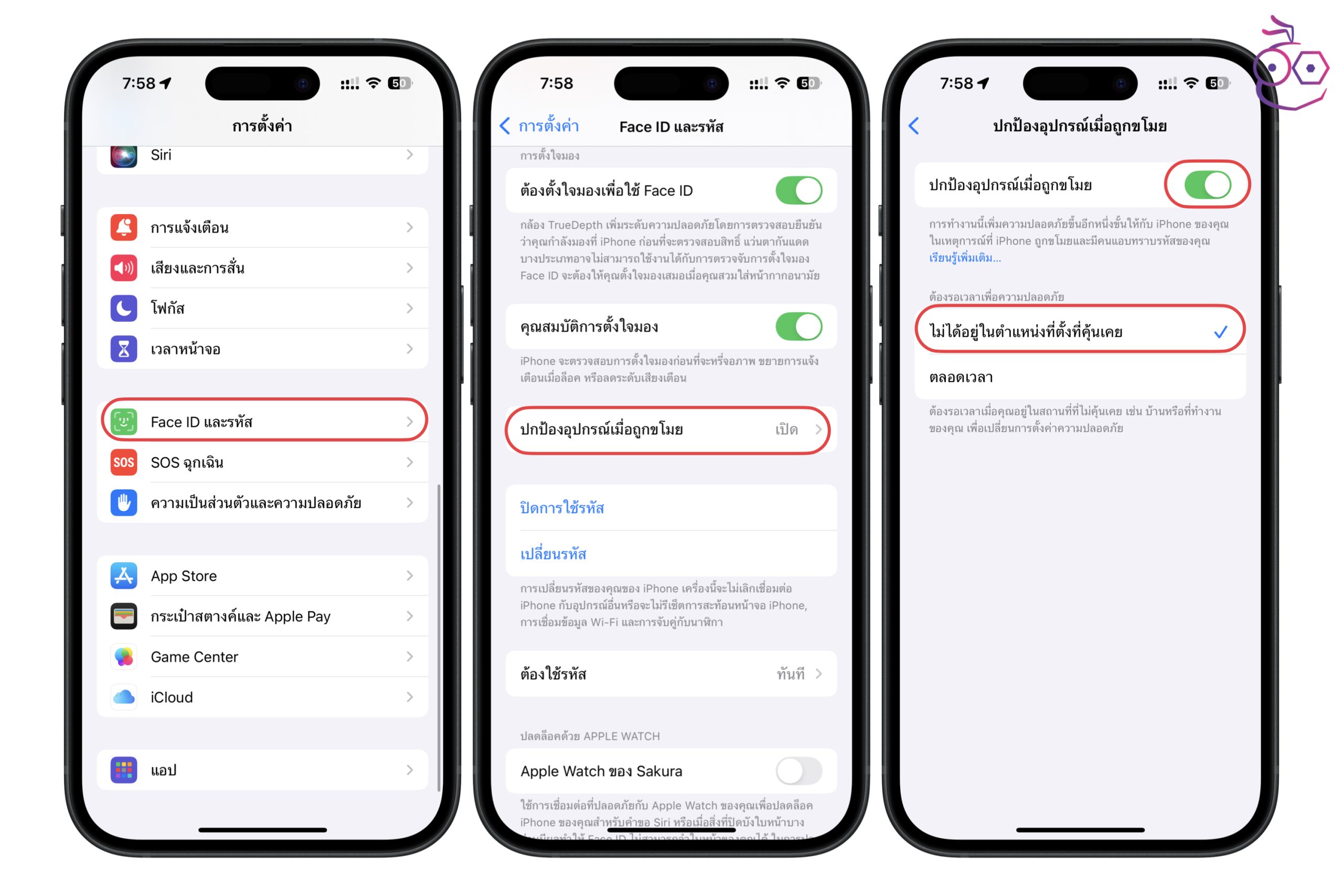 ไปที่การตั้งค่า (Settings) > Face ID และรหัส > ปกป้องอุปกรณ์เมื่อถูกขโมย > เปิดใช้งาน ปกป้องอุปกรณ์เมื่อถูกขโมย และอาจจะเลือกให้ฟีเจอร์นี้ทำงานเมื่อ iPhone ไม่ได้อยู่ในตำแหน่งที่ตั้งที่คุ้ยเคย