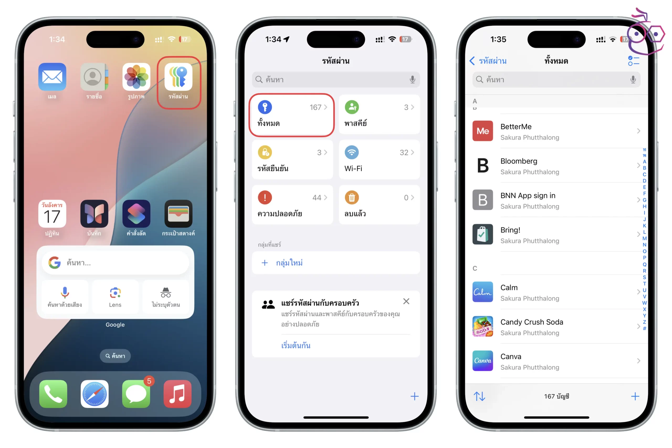 ไปที่ แอปรหัสผ่าน (Password) > แตะ ทั้งหมด เพื่อตรวจสอบหัสผ่านของแต่ละบัญชี หากมีการเปลี่ยนรหัสผ่านใหม่แล้วยังไม่ได้อัปเดต ก็สามารถเข้าไปอัปเดตในแต่ละบัญชีได้เลย