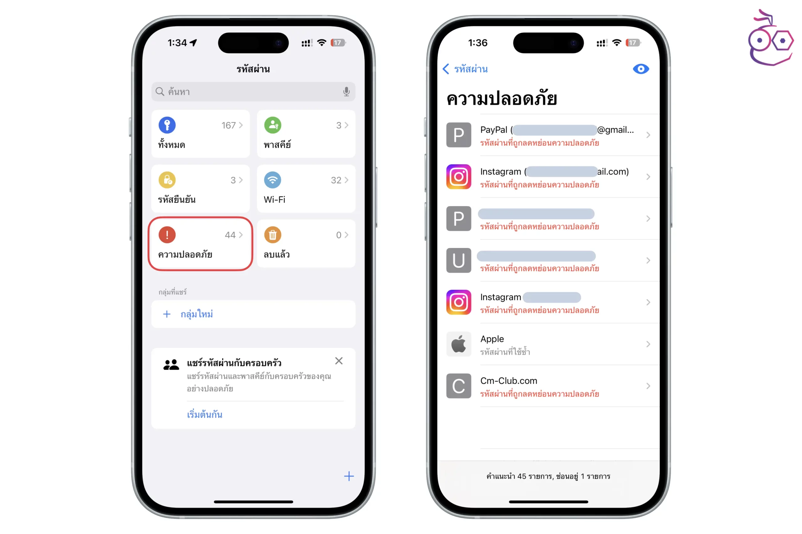 นอกจากนี้ เรายังสามารถตรวจสอบรหัสผ่านที่มีความเสี่ยงด้านความปลอดภัย โดยแตะเลือกส่วนของ ความปลอดภัย > เช็คดูว่ารหัสผ่านแต่ละรายการได้รับความเสี่ยงด้านไหน และทำการเปลี่ยนรหัสผ่านใหม่ให้ปลอดภัยมากขึ้น