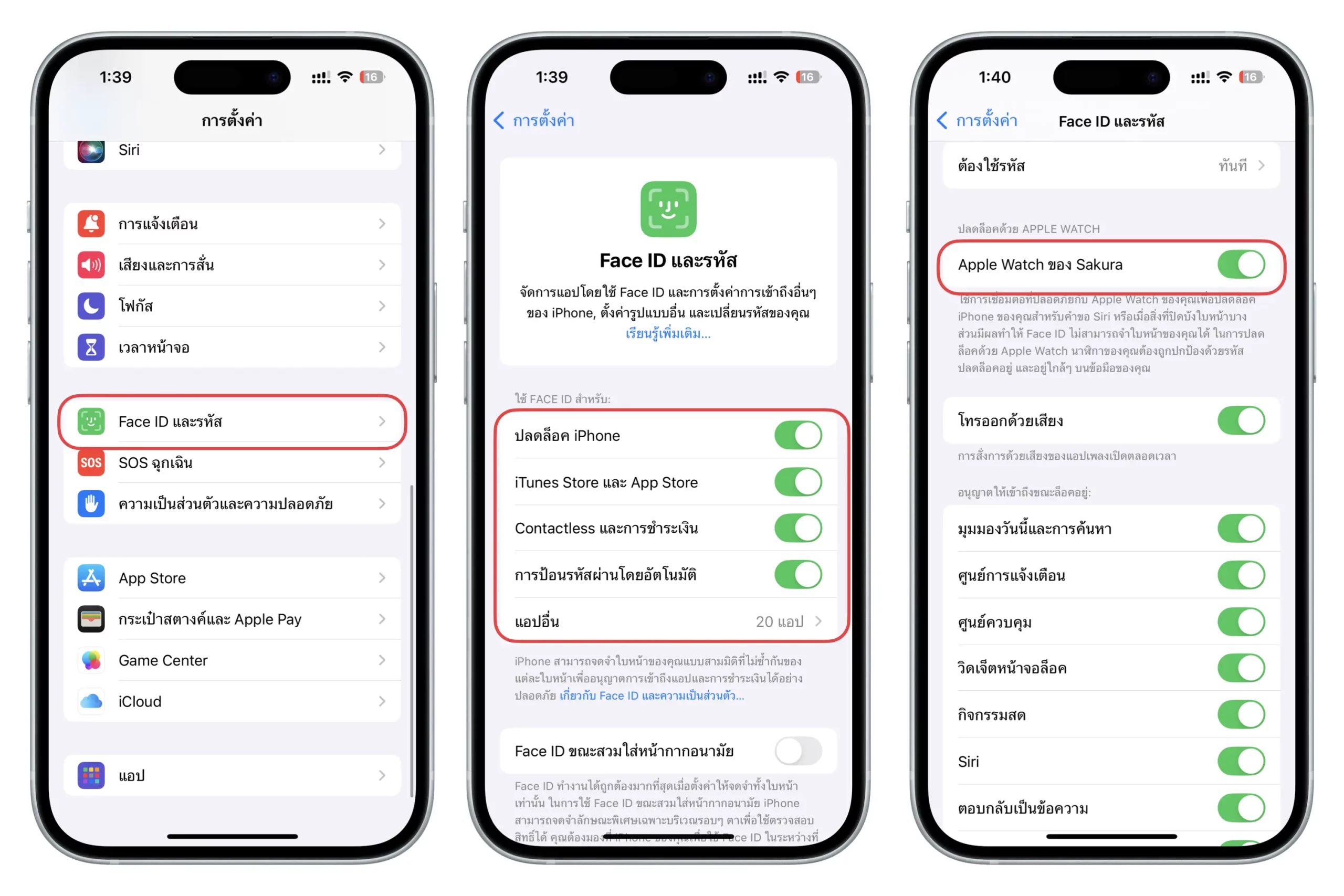 ไปที่ การตั้งค่า (Settings) > Face ID และรหัส (ใน iPhone ที่มีปุ่มโฮมจะเป็น TouchID และรหัส (Touch ID & Passcode) > ป้อนรหัสผ่านปลดล็อคเครื่อง 6 หลัก > แตะเปิด ปลดล็อค iPhone และตั้งค่า Face ID ให้เรียบร้อย > หากมี Apple Watch ก็สามารถเปิดการปลดล็อค iPhone ด้วย Apple Watch ได้ เพื่อความสะดวกในงานเข้าใช้งานเครื่องมากขึ้น