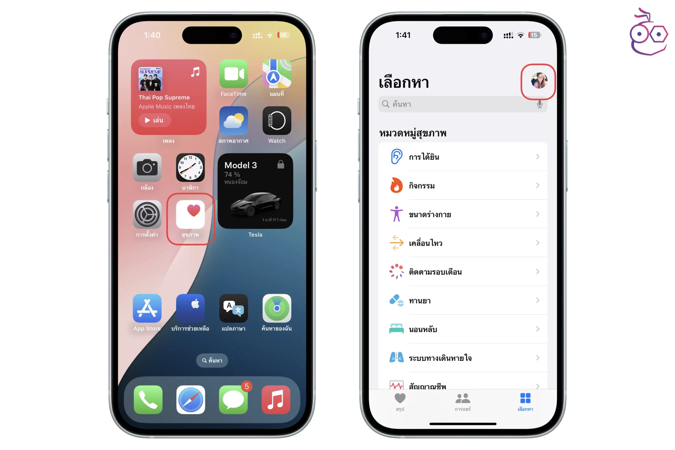 ไปที่ สุขภาพ (Health) > แตะโปรไฟล์ มุมบนขวา