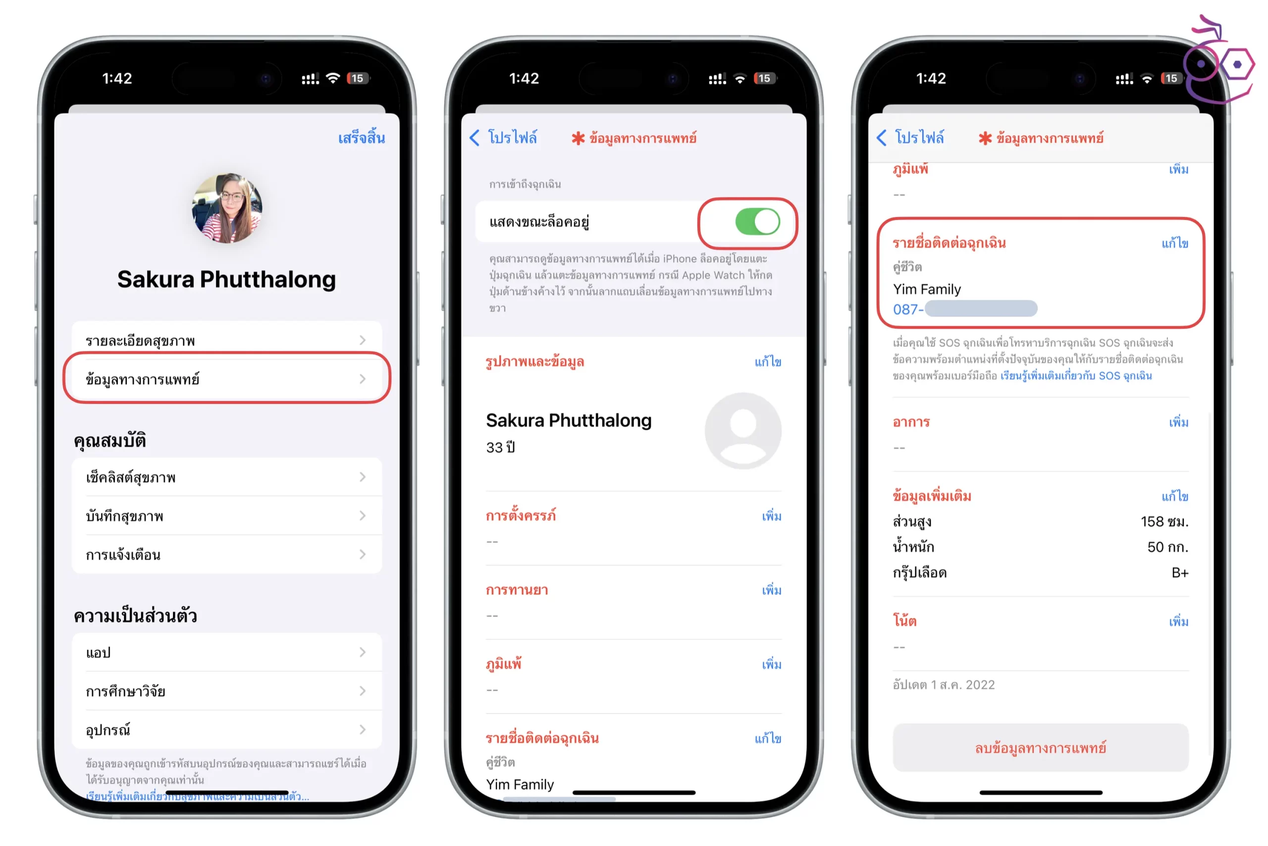 นอกจากนี้ ควรอัปเดตข้อมูลทางการแพยท์ด้วย โดยแตะ ข้อมูลทางการแพทย์ > เปิด แสดงขณะล็อคอยู่ เพื่อเวลาเกิดเหตุฉุกเฉิน ผู้ช่วยเหลือจะได้เข้าถงข้อมูลเราได้ > ป้อนข้อมูลที่จำเป็นให้เรียบร้อย โดยเฉพาะรายชื่อติดต่อฉุกเฉิน ที่เป็นคนในครอบครัวเราหรือบุคคลสำคัญ รวมถึงโรคประจำตัวต่าง ๆ โน้ตสำคัญ และแนะนำว่าให้อัปเดต ส่วนสูง น้ำหนัก ให้เป็นข้อมูลปัจจุบันด้วย เพื่อให้การวัดค่าสุขภาพมีความแม่นยำ