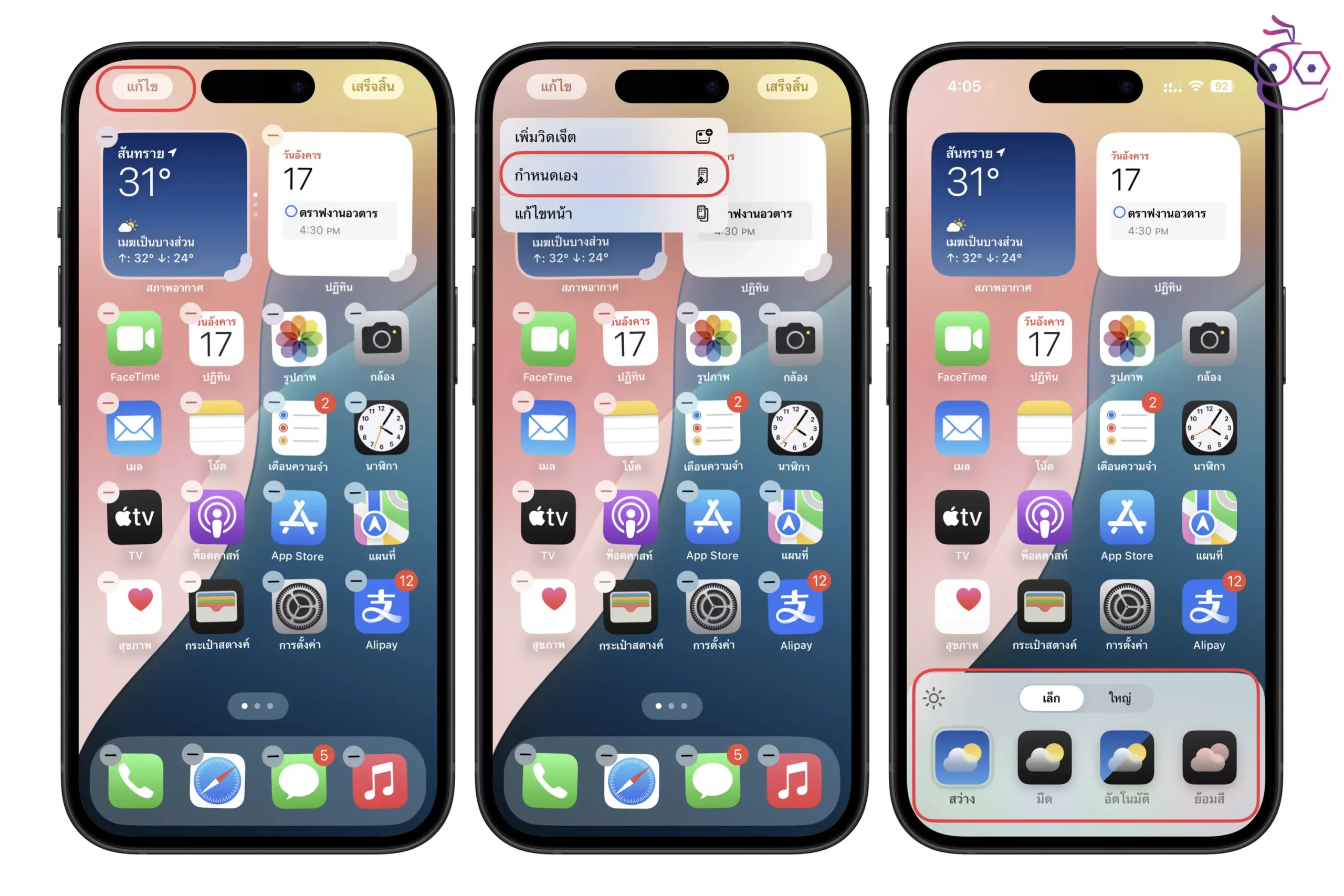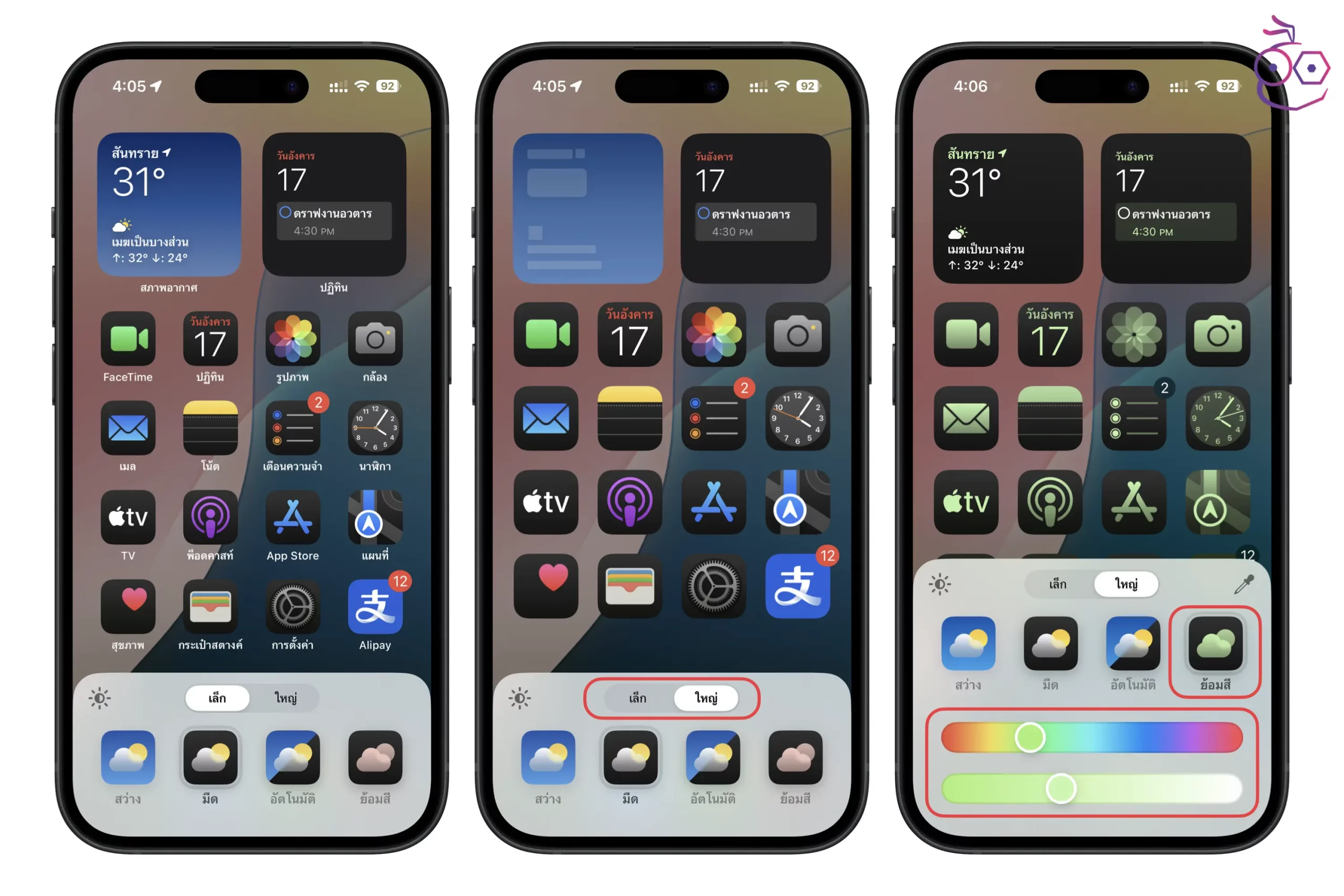 เลือกโทนสีของไอคอนแอป เป็นแบบ สว่าง มืด หรืออัตโนมัติตามเวลากลางวันและกลางคืน > สามารถแตะไอคอนรูปพระอาทิตย์มุมซ้าย เพื่อปรับโทนสีพื้นหลังเป็นสว่างและมืดได้ > ปรับขนาดไอคอนแอปแบบเล็กหรือใหญ่ (ถ้าเป็นขนาดใหญ่ จะไม่แสดงชื่อแอป) > สามารถย้อมสีไอคอนแอปตามที่ต้องการได้ด้วย