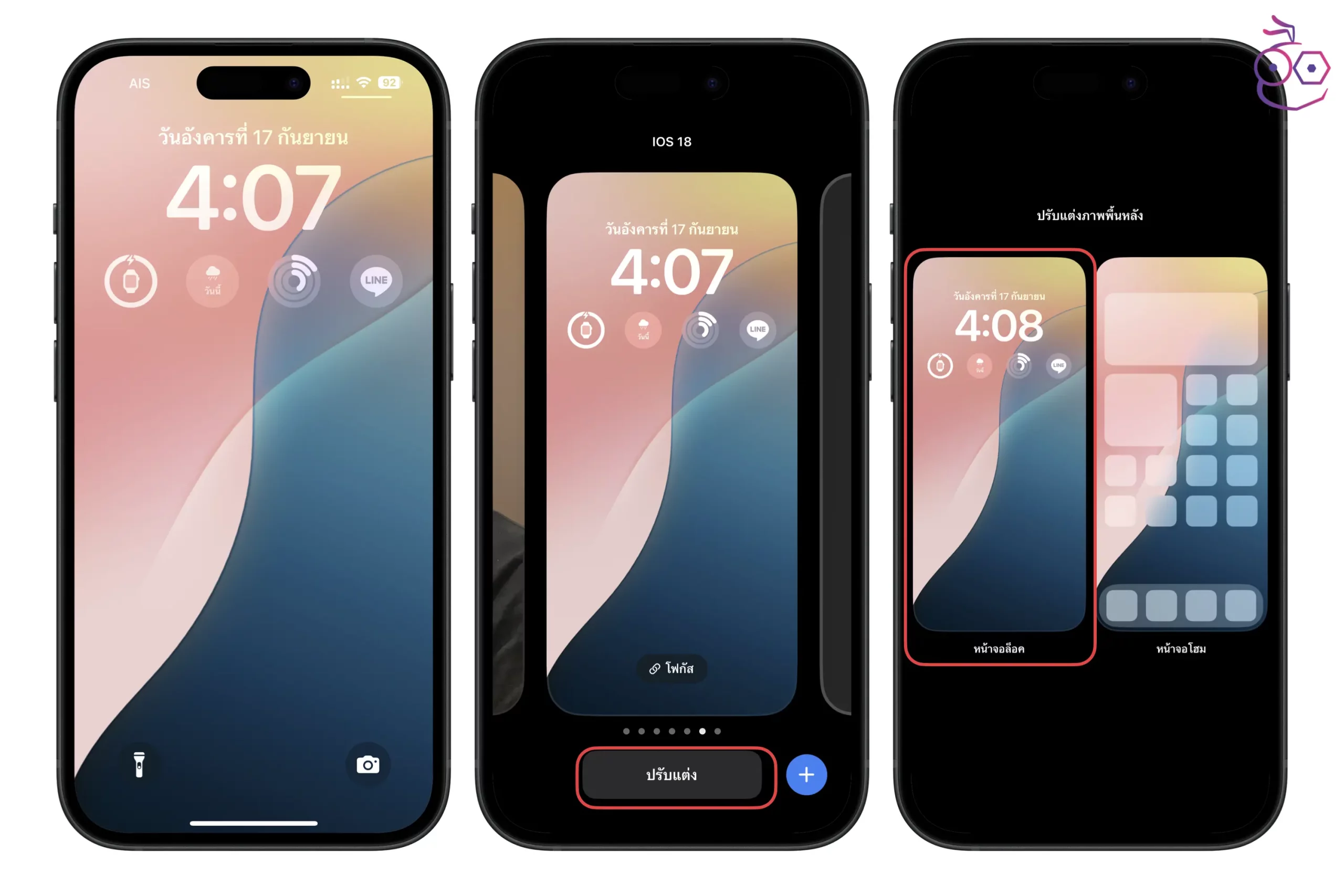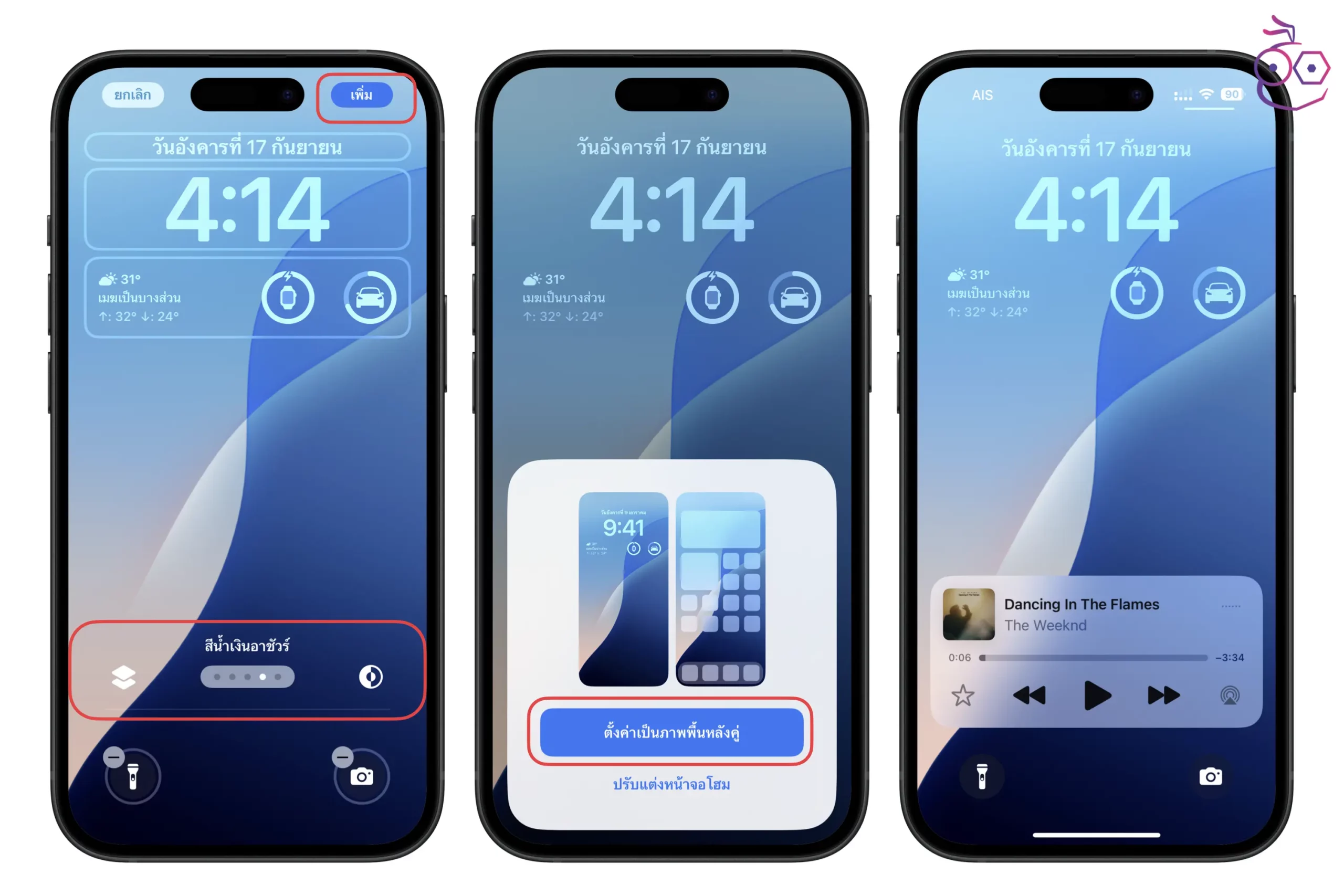 นอกจากนี้ เรายังสามารถเปลี่ยนโทนสีได้ในระหว่างปรับแต่ง หากปรับแต่งเรียบร้อยแล้วก็แตะปุ่ม เพิ่ม ได้เลย จากนั้นก็เลือกตั้งค่าเป็นภาพพื้นหลังคู่ (หรือจะปรับแต่งหน้าโฮมแยกต่างหากเพิ่มเติมก็ได้) เราก็จะได้หน้าโฮมใหม่ในธีม iOS 18 พร้อมกับวิดเจ็ตที่แสดงข้อมูลในหน้าจอล็อค