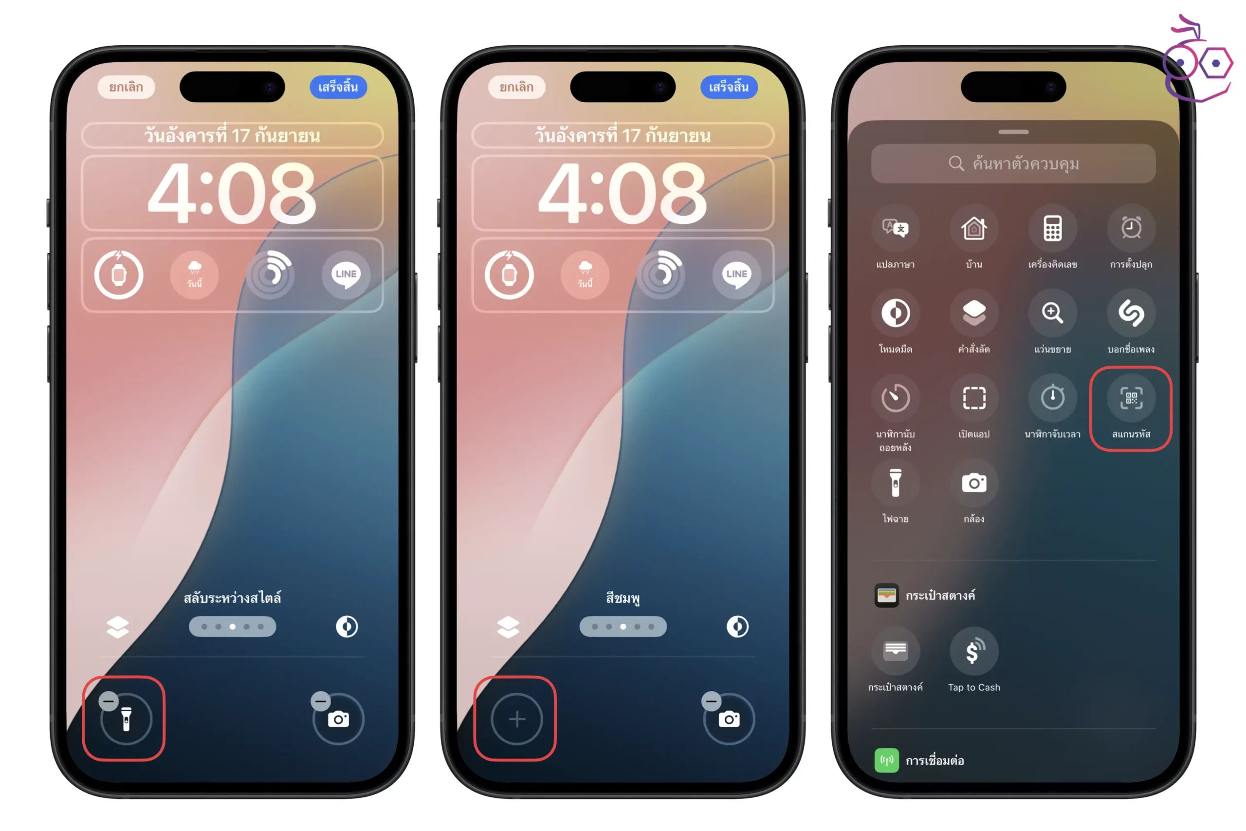 แตะ ลบที่ไอคอนไฟฉายหรือกล้อง > แตะ ปุ่ม + > เลือกตัวควบคุมที่ต้องการได้เลย
