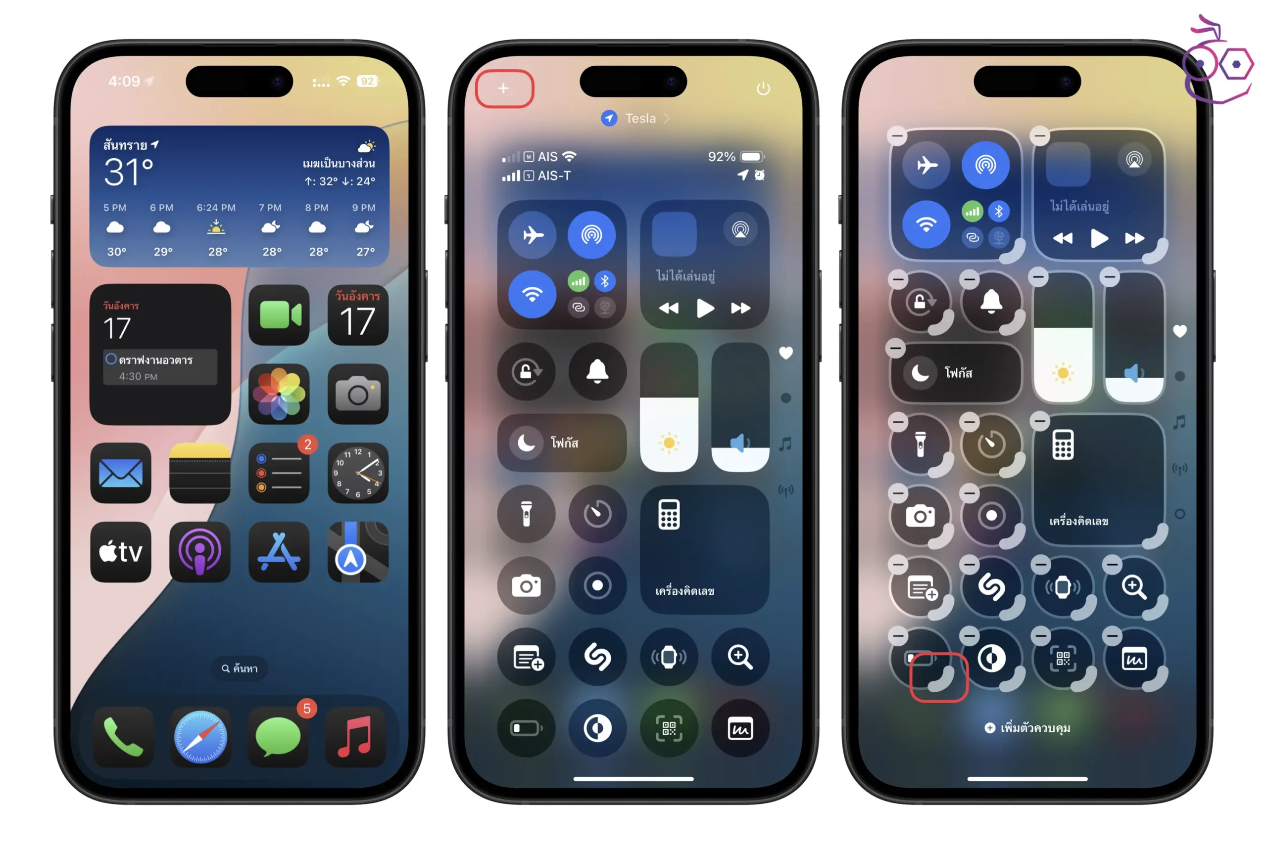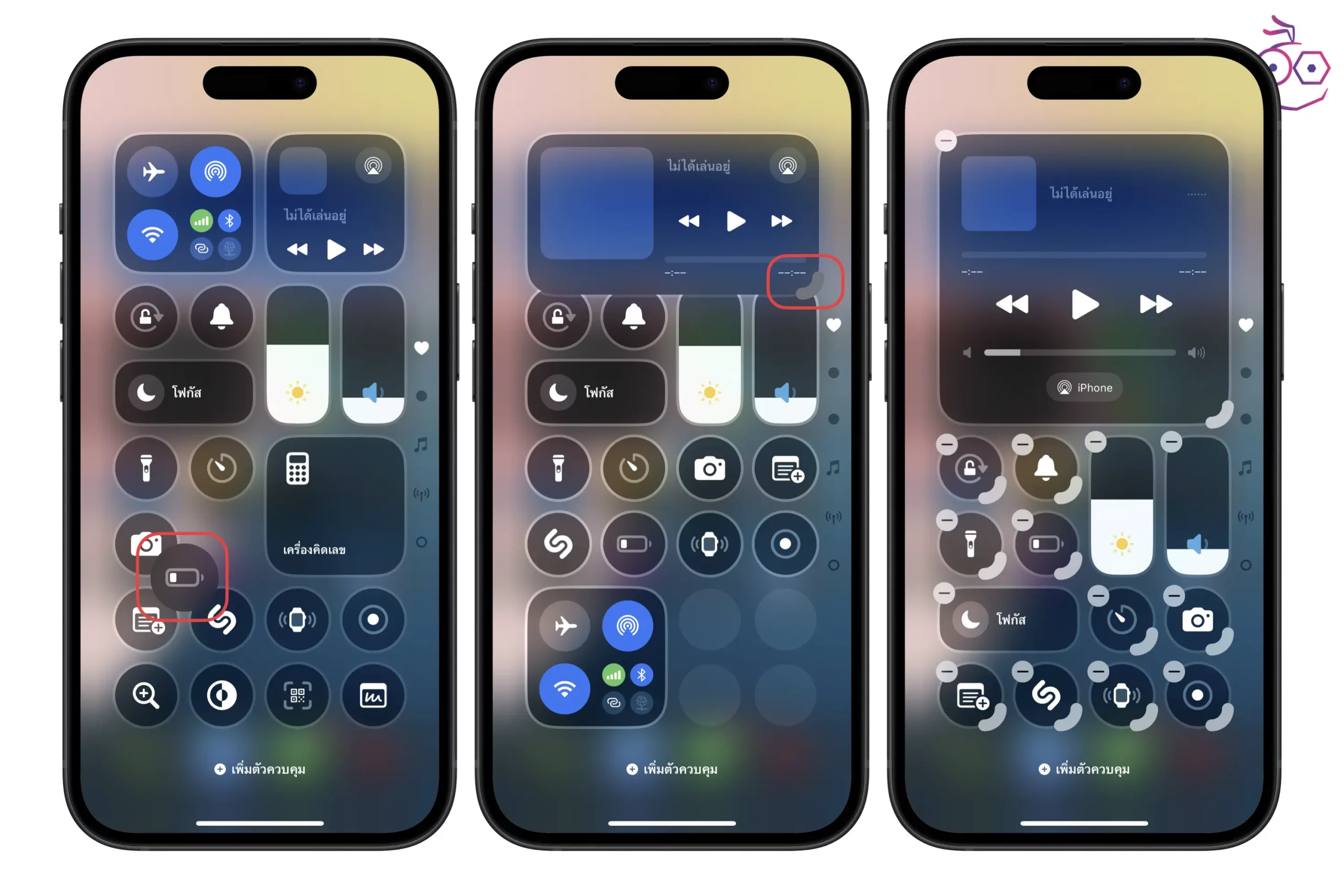 ปัดหน้าจอมุมบนขวาลงเมื่อ เพื่อเปิดหน้า Control Center > แตะ ไอคอน + > สามารถแตะไอคอนส่วนควบคุม แล้วลากเพื่อย้ายไปยังตำแหน่งที่ต้องการได้เลย