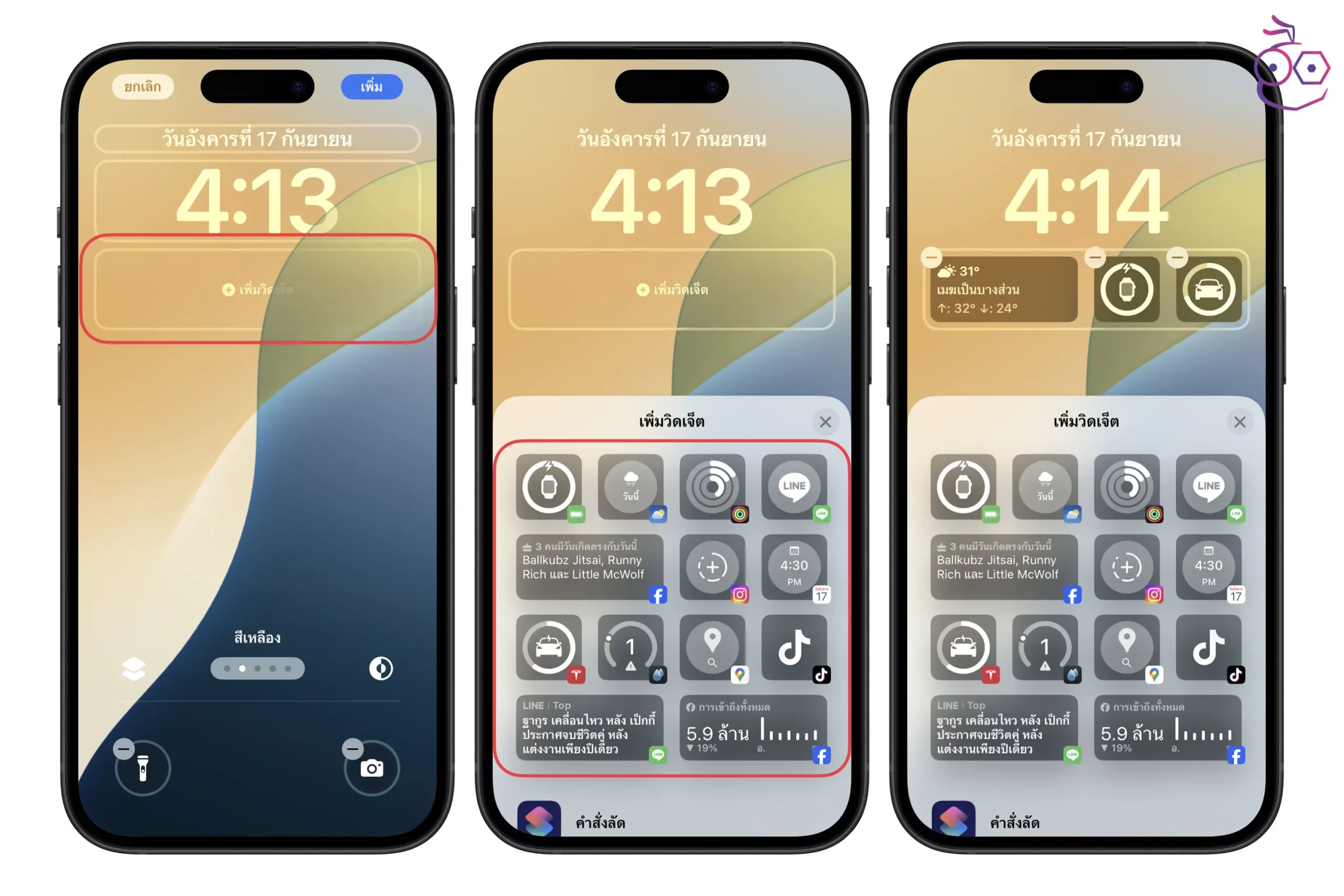 จากนั้นก็แตะ เพิ่มวิดเจ็ต แล้วเลือกวิดเจ็ตที่ต้องการแสดงให้หน้าจอล็อคสูงสุด 4 วิดเจ็ต กรณที่เป็นขนาดเล็ก (วิดเจ็ตหน้าจอล็อคนั้นมีมาตั้งแต่ iOS 17 แล้ว เผื่อว่าใครยังไม่ทราบก็ทำตามนี้ได้เลย)