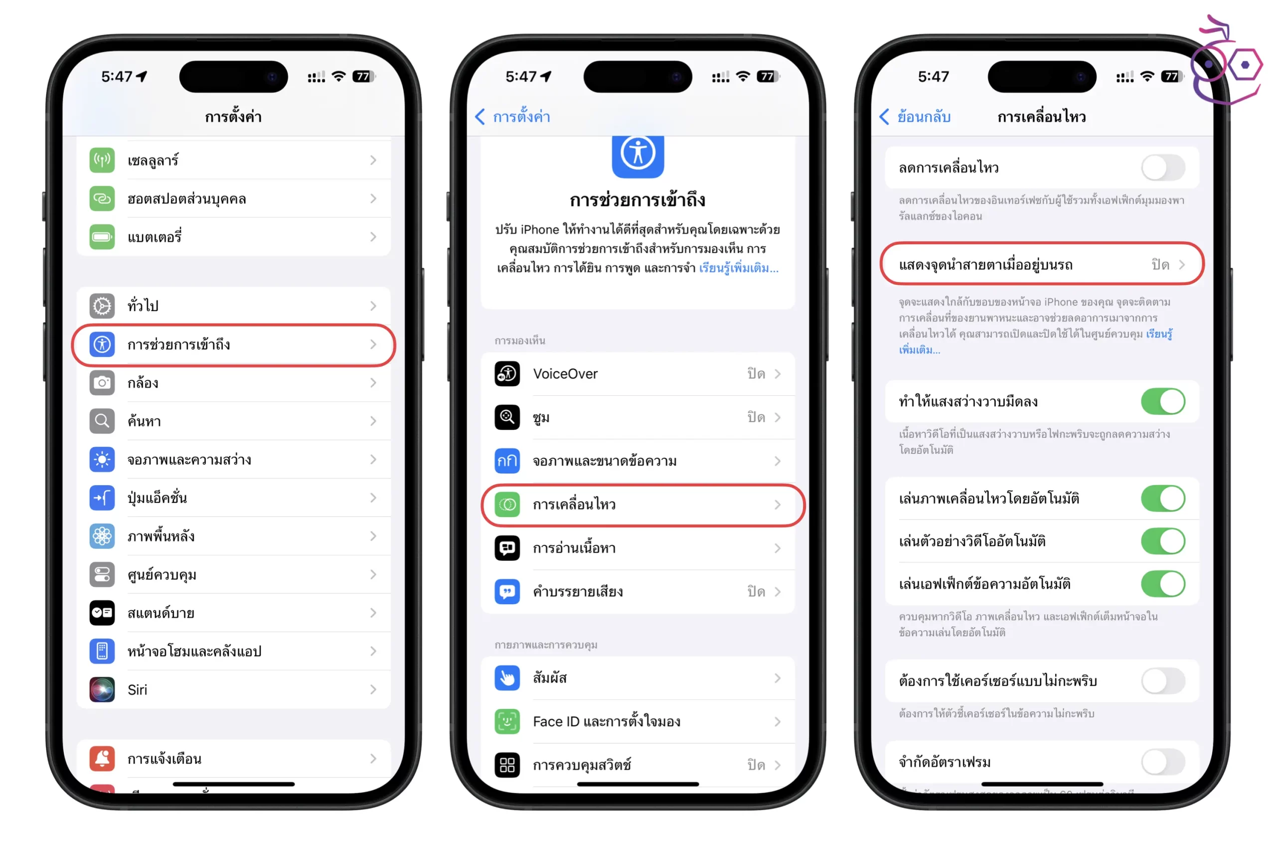 ไปที่ การตั้งค่า > การช่วยการเข้าถึง > การเคลื่อนไหว > แสดงจุดนำสายตาเมื่ออยู่บนรถ