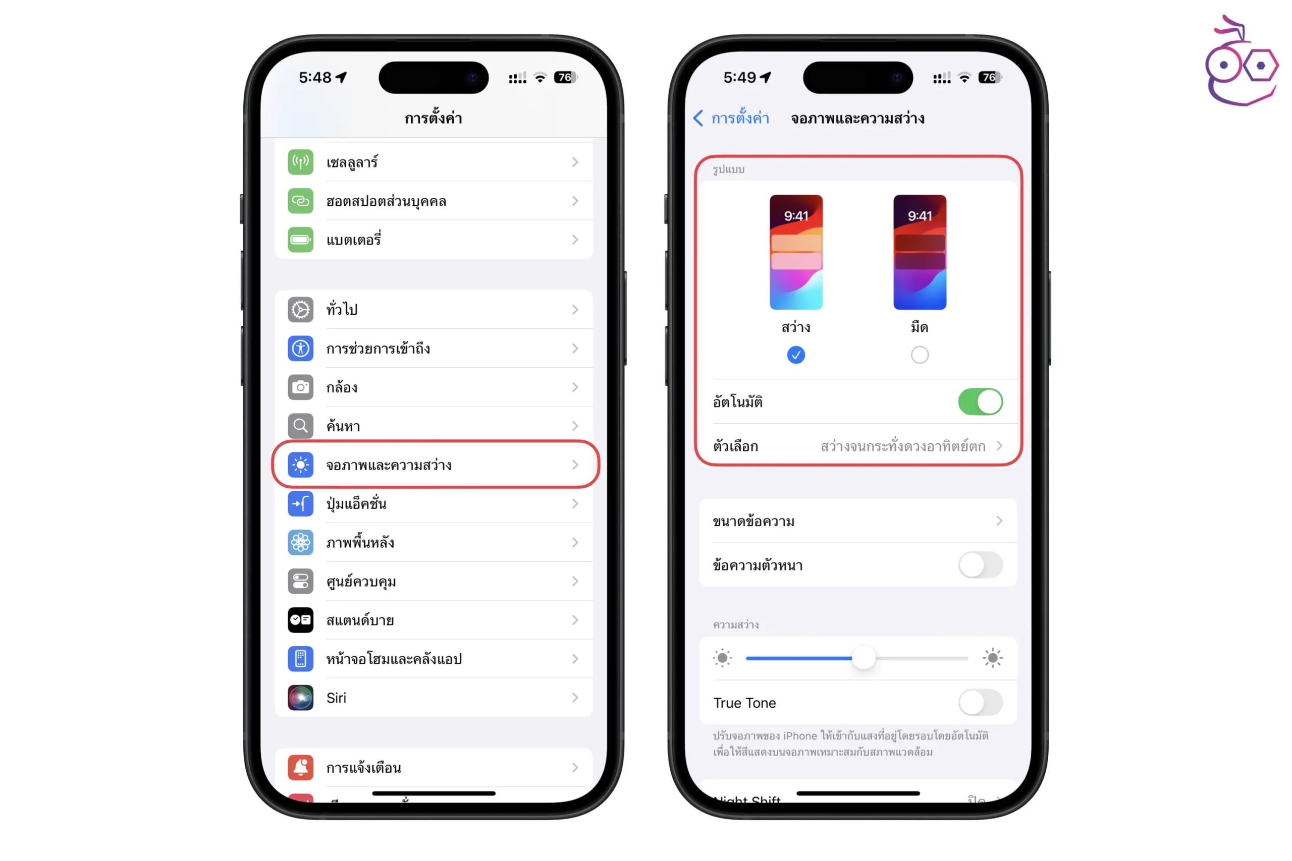 ไปที่การตั้งค่า (Settings) > จอภาพและความสว่าง (Display & Brightness) > เปิด อัตโนมัติ