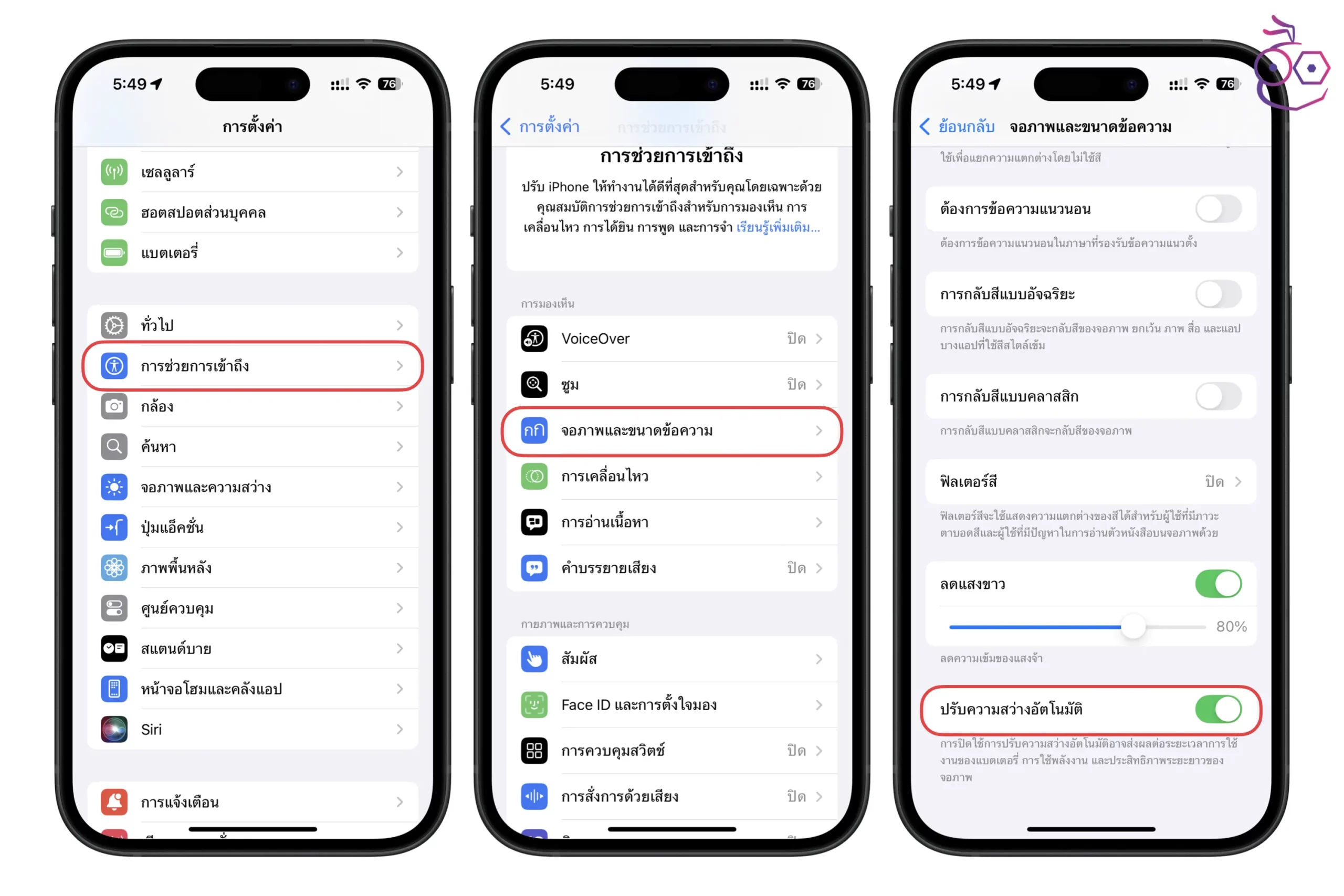 ไปที่ การตั้งค่า > การช่วยการเข้าถึง > จอภาพและขนาดข้อความ > ปรับความสว่างอัตโนมัติ