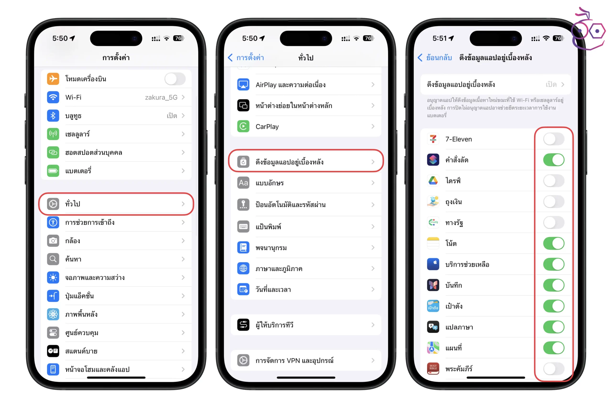 การตั้งค่า > ทั่วไป > ดึงข้อมูลแอปจากเบื้องหลัง > เลื่อนปิดแอปที่ไม่ต้องการให้ดึงข้อมูล