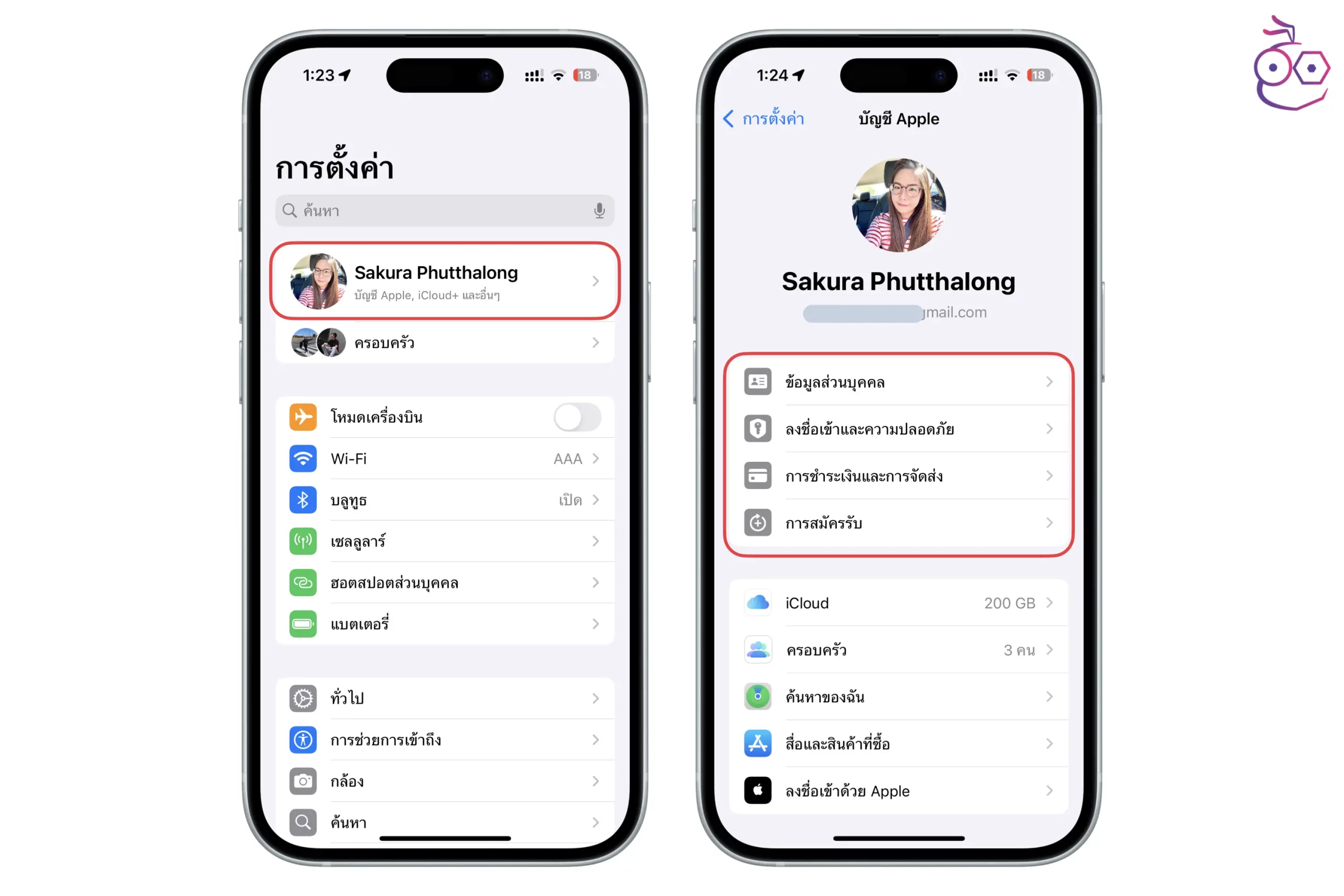 ไปที่ การตั้งค่า (Settings) > Apple Account > เข้าไปตรวจสอบข้อมูลและตั้งค่าในส่วนที่สำคัญให้เรียบร้อย ว่ากรอกข้อมูลถูกต้องหรือไม่ ดังนี้