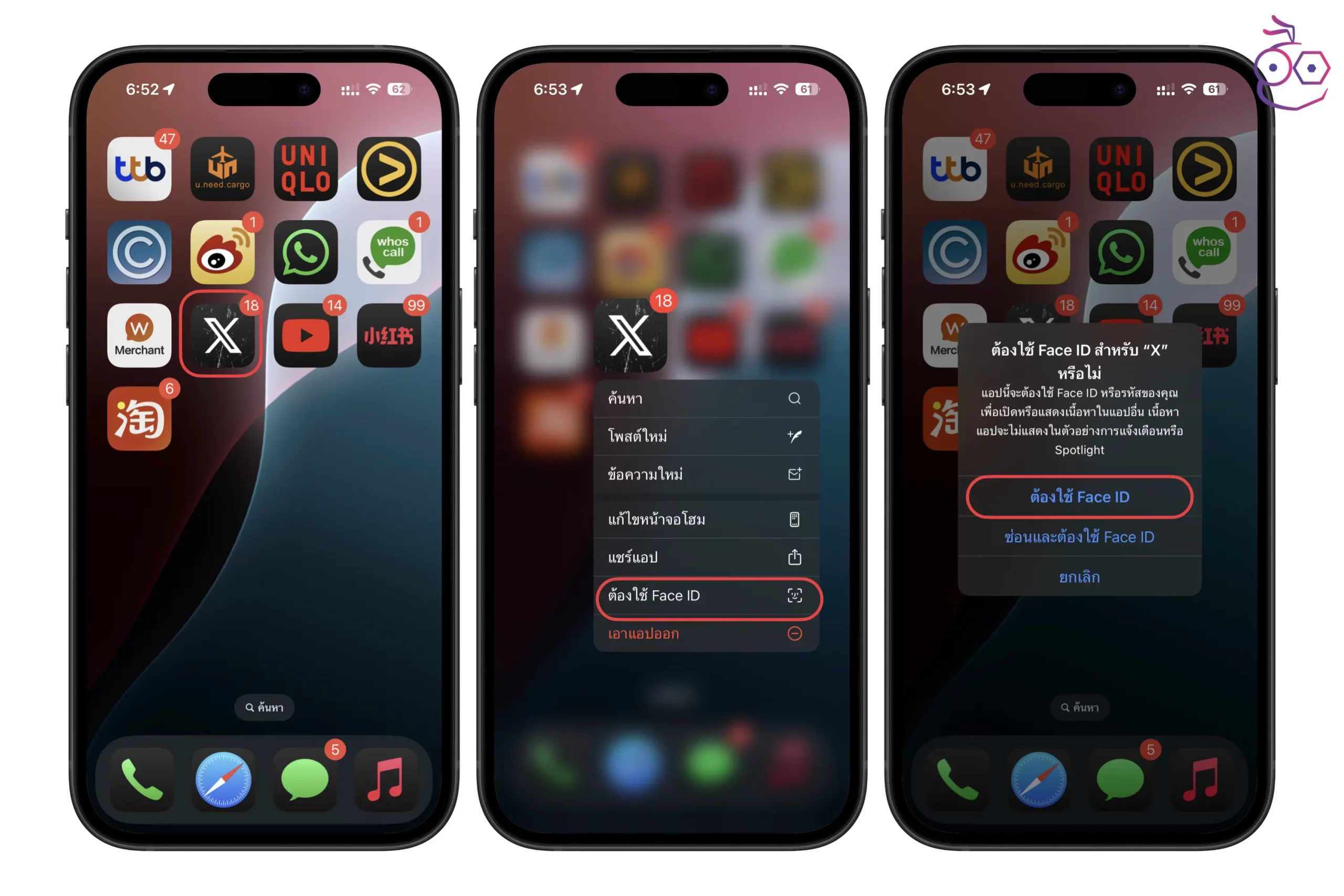 การล็อคแอปทำได้โดย แตะค้างที่แอปบนหน้าโฮม เลือก ต้องใช้ Face ID > แตะ ต้องใช้ Face ID หลังจากที่ล็อคแอปแล้ว การเข้าแอปนั้นครั้งถัดไป จะต้องมีสแกน Face ID หรือป้อนรหัสผ่านก่อนทุกครั้ง