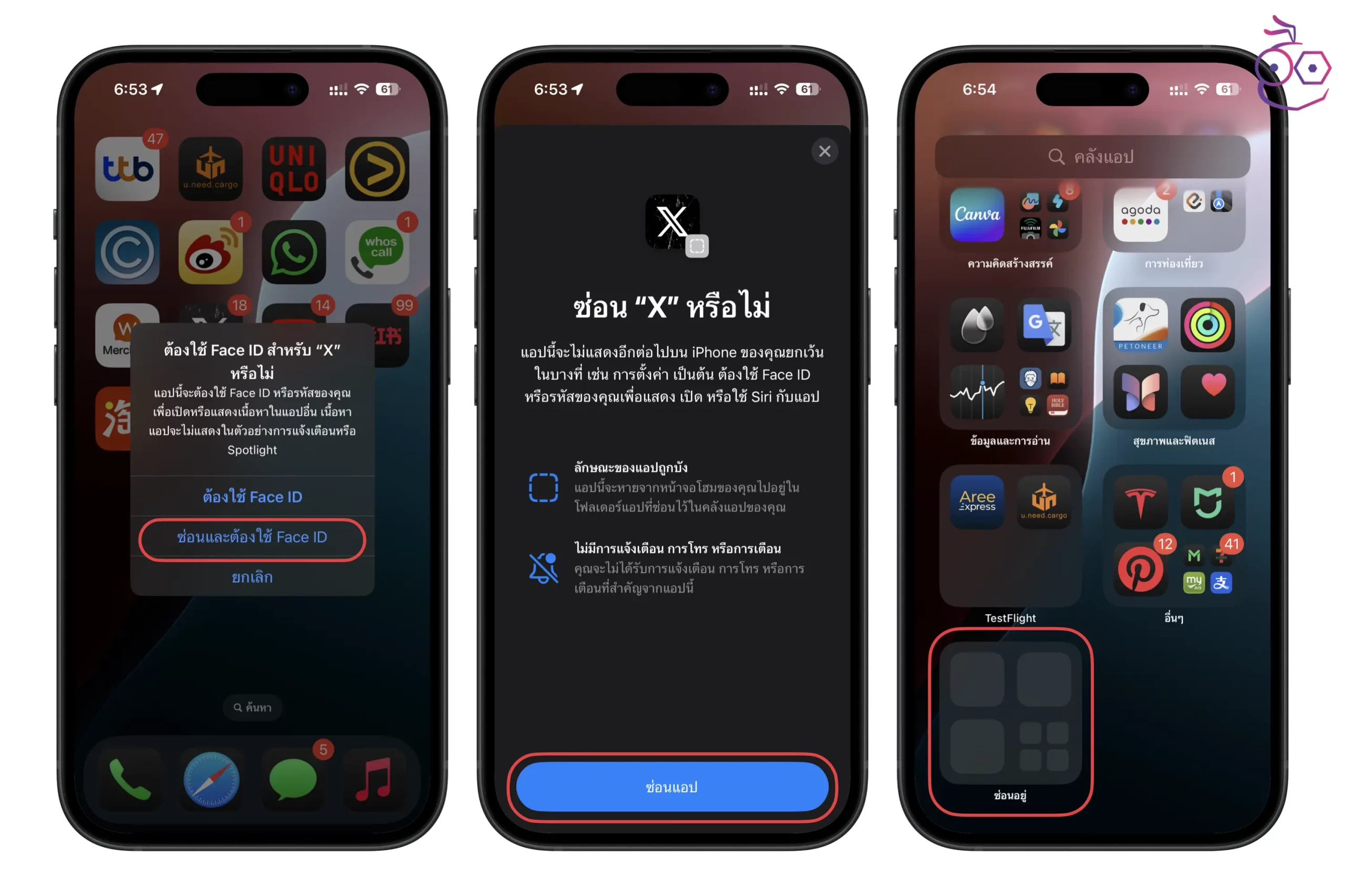 ส่วนการซ่อนแอป สามารถแตะ ซ่อนและต้องใช้ Face ID ได้เลย > แตะ ซ่อนแอป > แอปจะถูกย้ายไปที่โฟลเดอร์ ซ่อนอยู่