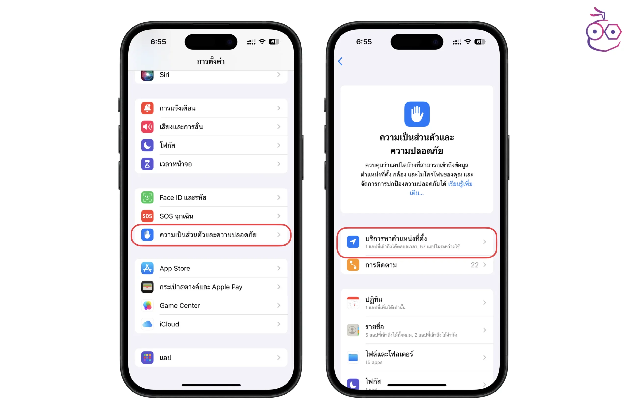 ไปที่ การตั้งค่า (Settings) > ความเป็นส่วนตัวและความปลอดภัย (Priavacy & Security) > บริการหาตำแหน่งที่ตั้ง (Location Services)