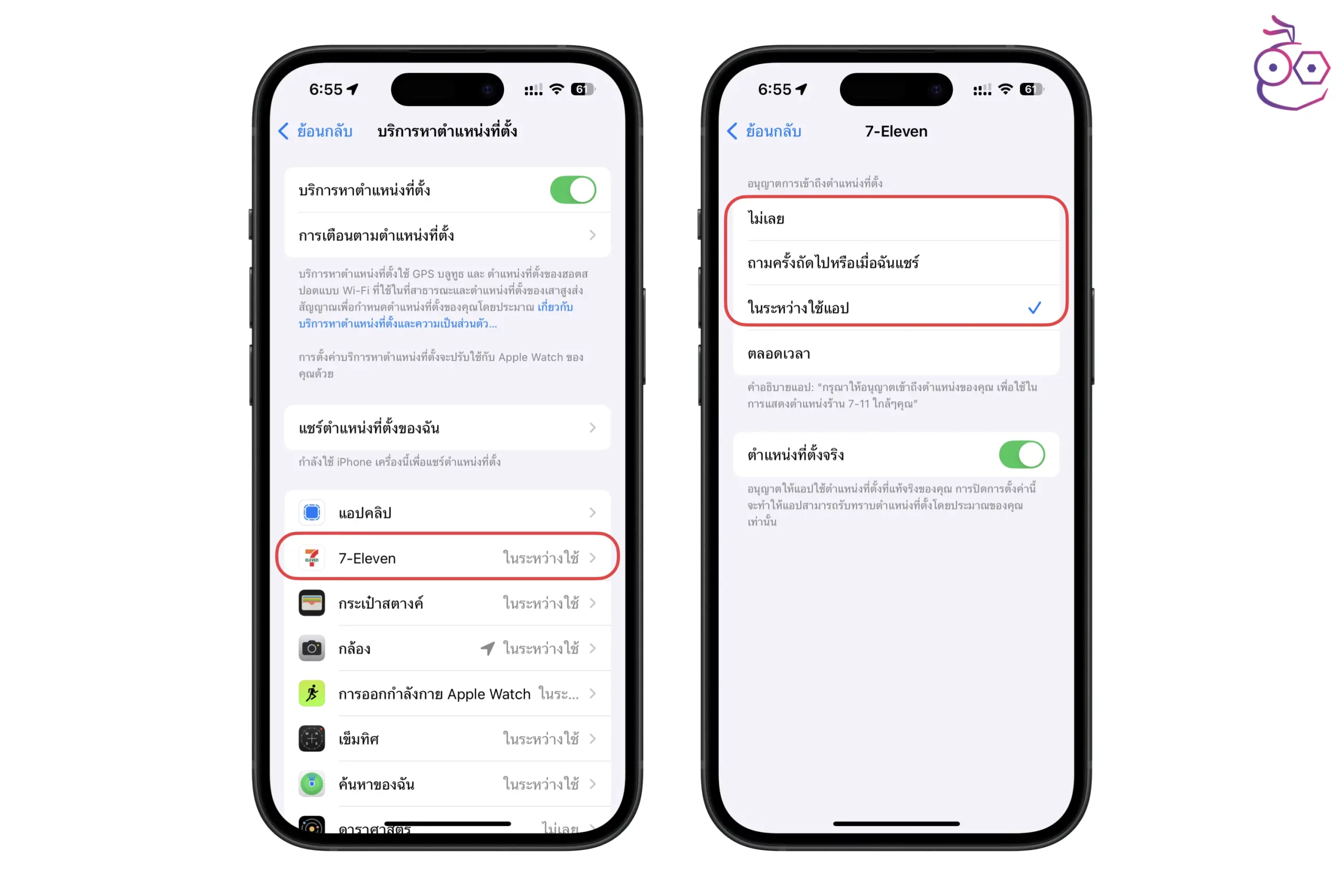 เลือกแอปด้านล่าง > ปรับตั้งค่าให้เป็นในระหว่างใช้แอป สำหรับแอปที่จำเป็นต้องใช้ตำแหน่งที่ตั้ง และปรับเป็นไม่เลย สำหรับแอปที่ไม่ต้องใช้ตำแหน่งที่ตั้ง ส่วนแอปที่ยังไม่แน่ใจก็สามารถตั้งเป็น ถามครั้งถัดไปเมื่อฉันแชร์ได้