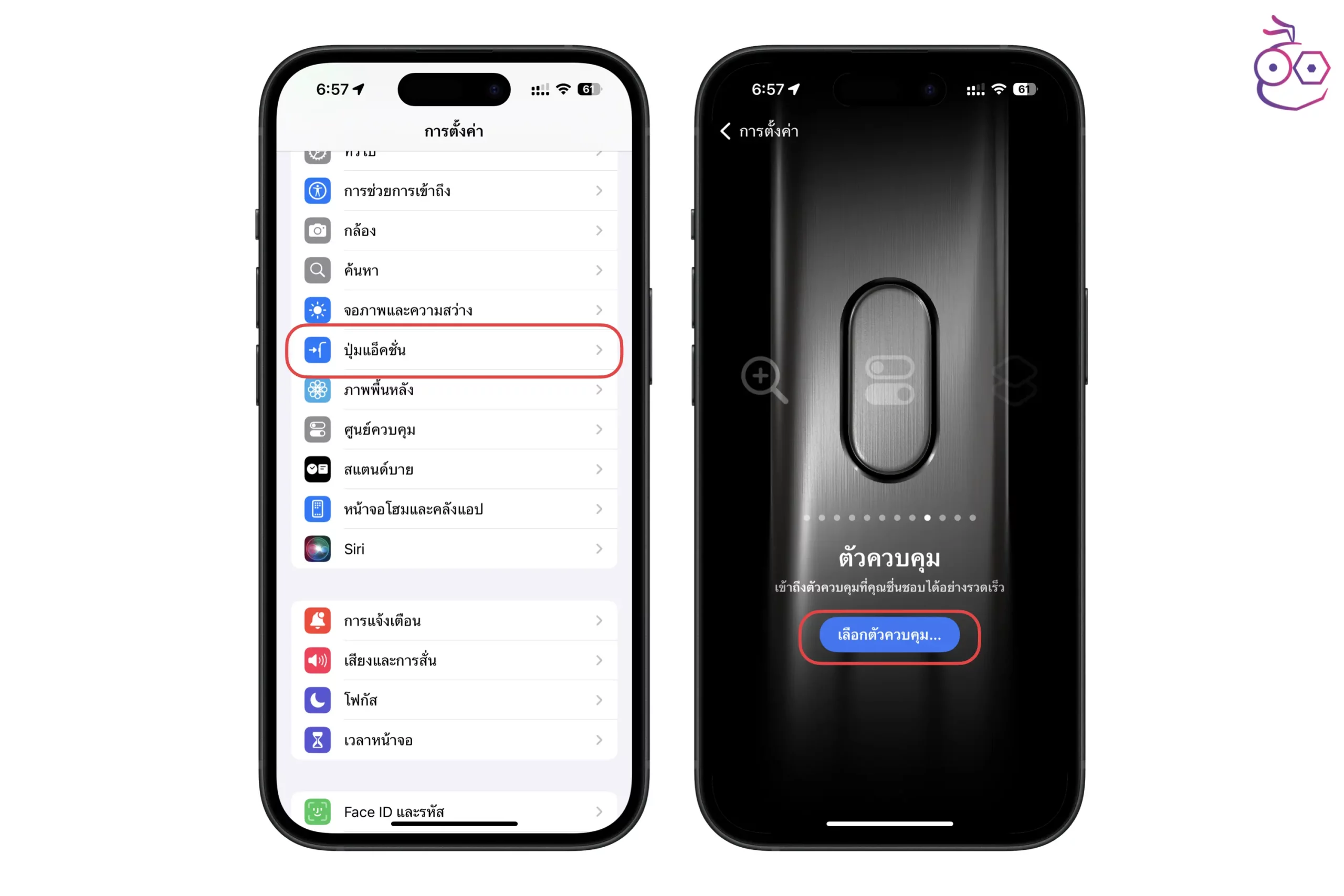 ไปที่การตั้งค่า > ปุ่มแอ็คชั่น > เลื่อนไปยัง ตัวควบคุม แล้วแตะ เลือกตัวควบคุม