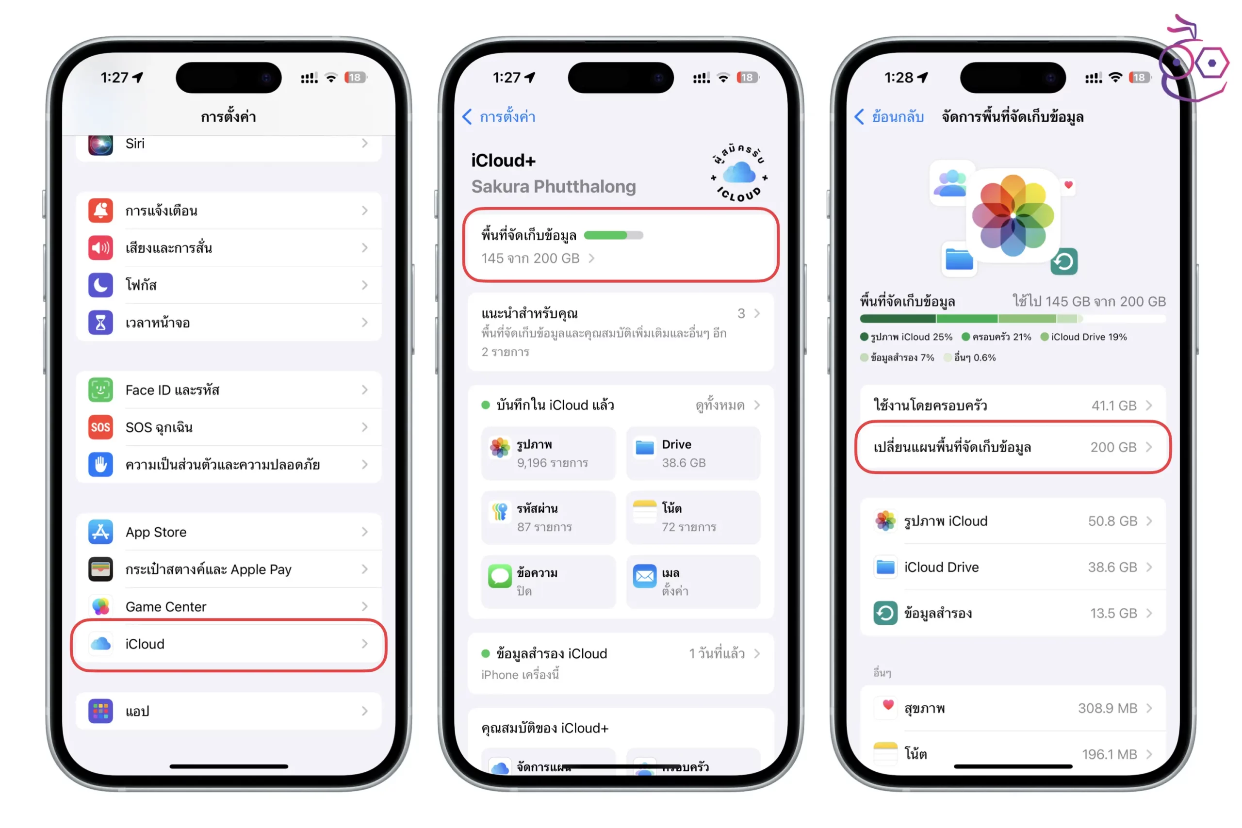 ไปที่ การตั้งค่า (Settings) > เลื่อนลงด้านล่าง แตะ iCloud > แตะพื้นที่จัดเก็บข้อมูล เพื่อเช็คว่าใช้พื้นที่กับข้อมูลส่วนใดบ้าง สามารถลบส่วนที่ไม่จำเป็นออกได้หรือไม่ เพื่อคืนพื้นที่ใช้งานมากขึ้น > หรือถ้าหากต้องเก็บข้อมูลที่จำเป็นไว้ แต่พื้นที่ iCloud เหลือน้อย ก็อาจจะเลือก เปลี่ยนแผนพื้นที่จัดเก็บข้อมูล เพื่ออัปเกรดพื้นที่เพิ่มมากขึ้น