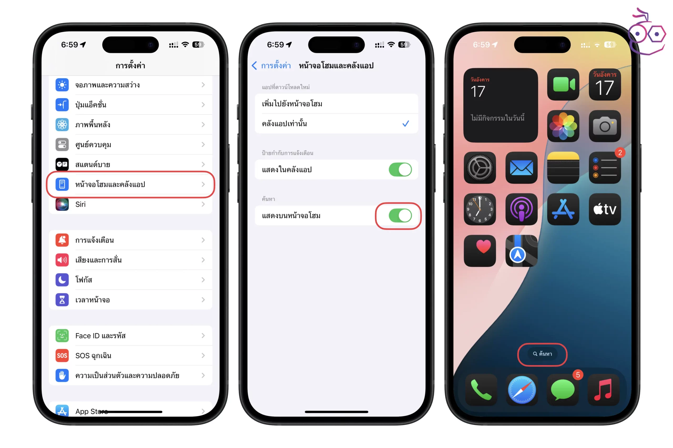 ไปที่ การตั้งค่า > หน้าจอโฮมและคลังแอป > ในส่วนค้นหา ให้เปิด แสดงบนหน้าจอโฮม (แต่ถ้าใครไม่อยากให้ส่วนค้นหาแสดง เนื่องจากมือปัดไปโดนบ่อย ๆ ก็ปิดใช้งานไว้ได้ ส่วนค้นหาก็จะแสดงไอคอนจุดที่เป็นจำนวนหน้าโฮมแทน)