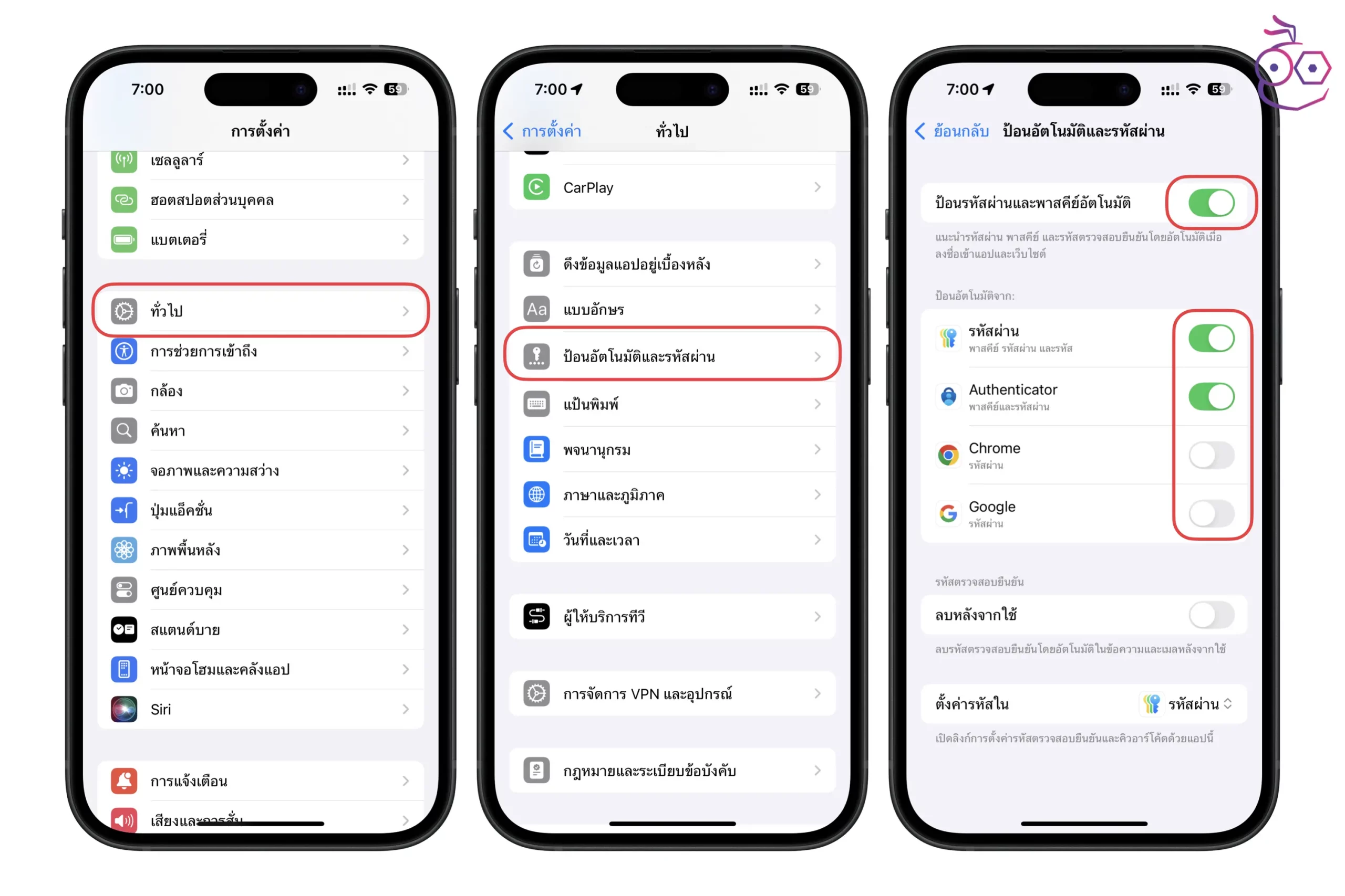 ไปที่ การตั้งค่า > ทั่วไป > ป้อนอัตโนมัติและรหัสผ่าน > เปิดใช้งาน ป้อนรหัสผ่านและพาสคีย์อัตโนมัติ และด้านล่างก็เลือกเปิดใช้งานการป้อนอัตโนมัติตามแอปที่ต้องการ
