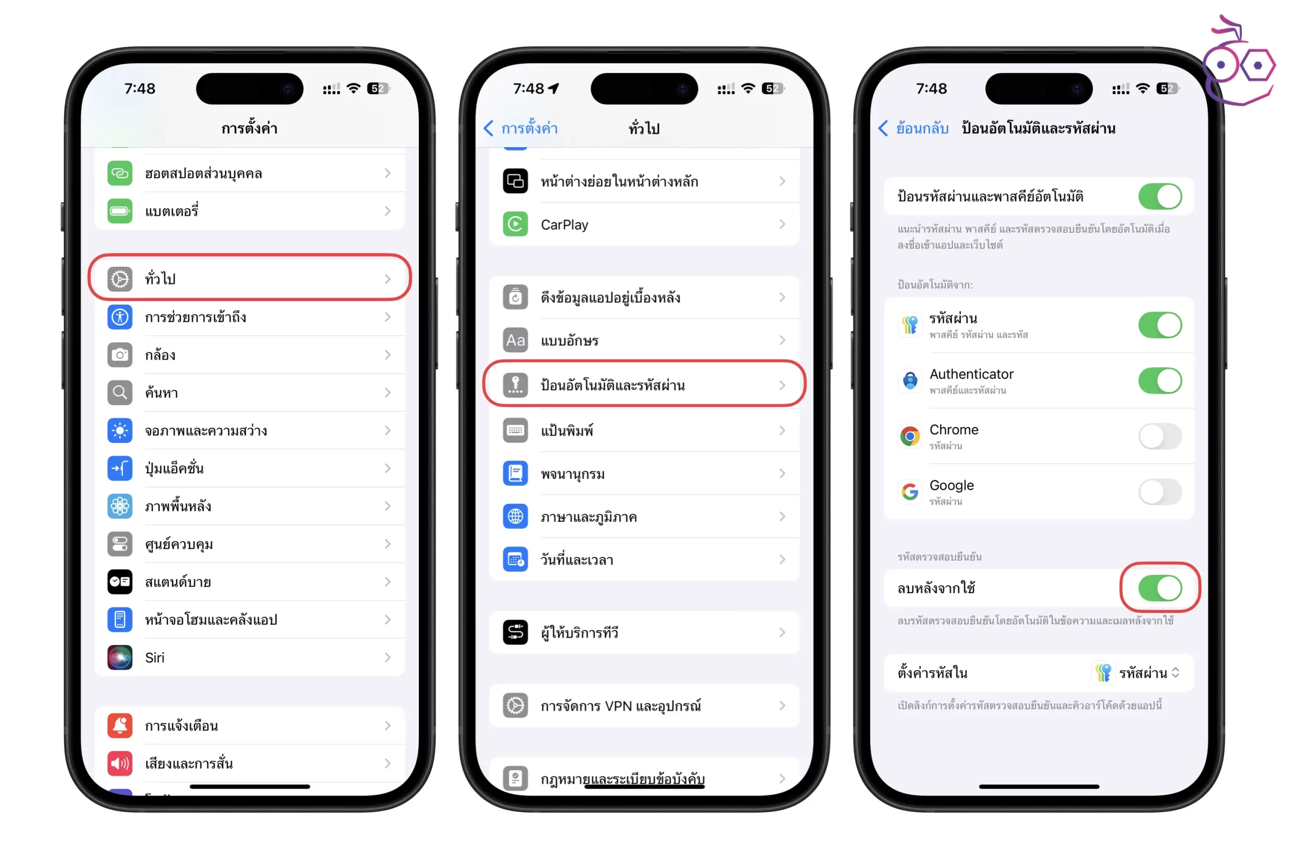 ไปที่ การตั้งค่า > ทั่วไป > ป้อนอัตโนมัติและรหัสผ่าน > ส่วน ตรวจสอบยืนยัน ให้เปิดใช้งาน ลบหลังจากใช้งาน