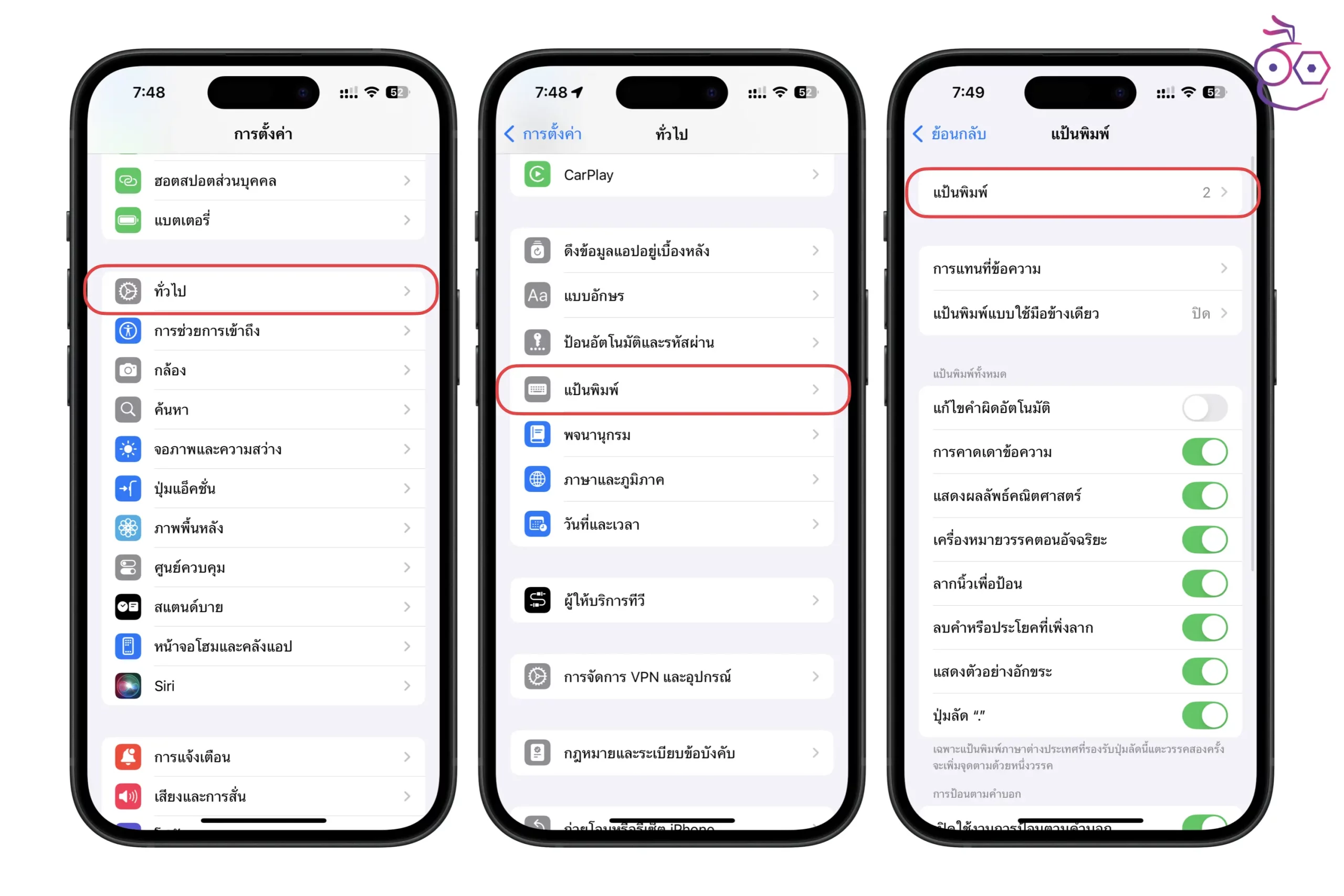 การตั้งค่า (Settings) > ทั่วไป (General) > แป้นพิมพ์ (Keyboard) > แป้นพิมพ์ (Keyboard)