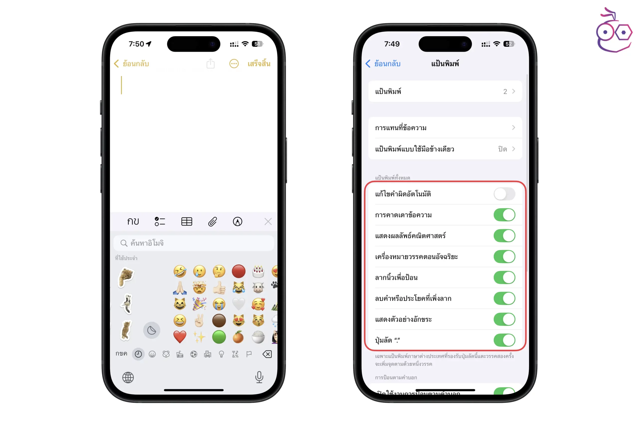 บนแป้นพิมพ์ก็จะแสดงอิโมจิ หรือแป้นพิมพ์ภาษาอื่น ๆ ที่เราตั้งค่าเพิ่มเข้ามา นอกจากนี้ เรายังสามารถตั้งค่าแป้นพิมพ์ให้ใช้สะดวกมากขึ้น เช่น การปิดการแก้ไขคำผิดอัตโนมัติ เปิดการคาดเดาคำ แสดงผลลัพธ์คณิตศาสตร์ เมื่อใช้ในแอปโน้ต เป็นต้น ก็ลองตั้งค่ากันดู