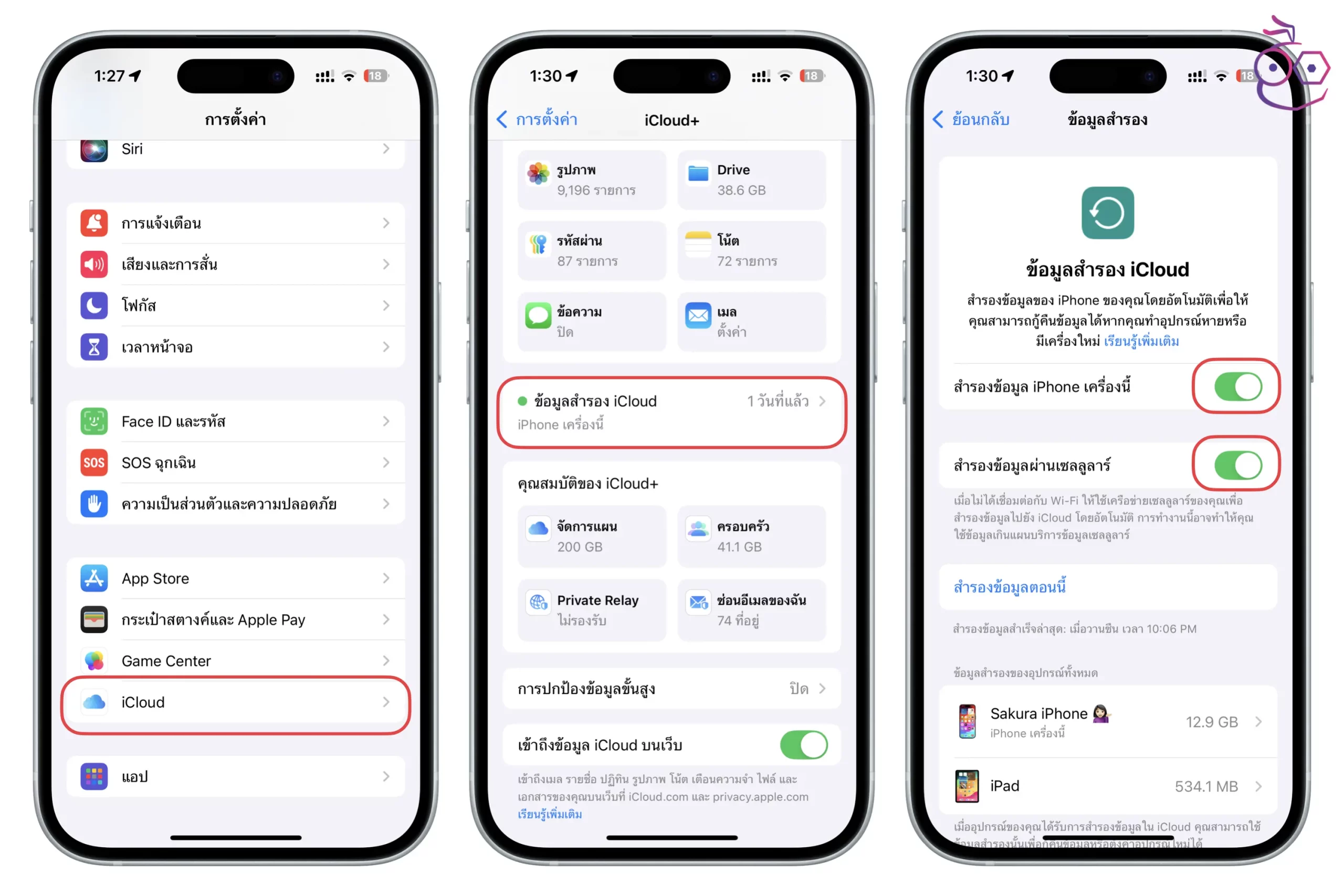 ไปที่ การตั้งค่า (Settings) > เลื่อนลงด้านล่าง แตะเมนู iCloud > แตะ ข้อมูลสำรอง iCloud > เปิด สำรองข้อมูล iPhone เครื่องนี้ (ถ้าหากเราใช้แพ็กเกจอินเทอร์เน็ต 4G/5G แบบไม่จำกัดก็สามารถเปิดการสำรองข้อมูลผ่านเซลลูลาร์ด้วยได้)