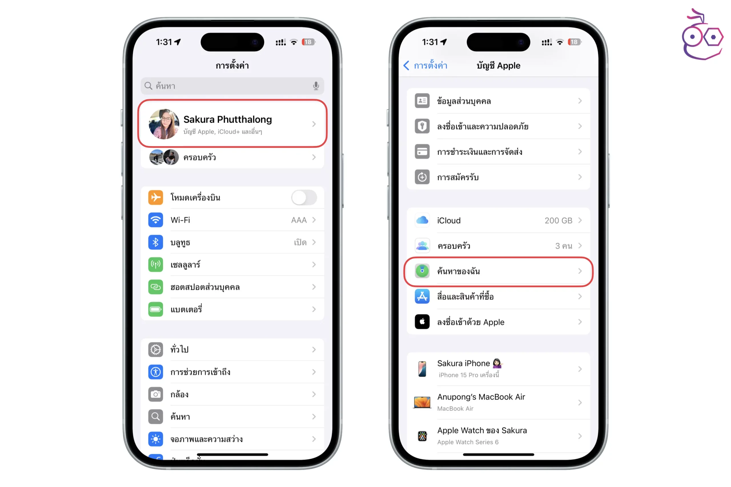 แนะนำให้เข้าไปเปิดการตั้งค่าทุกอย่าง โดยเฉพาะ เครือข่าย “ค้นหาของฉัน” ที่เป็นฟีเจอร์ที่เราสามารถค้นหา iPhone ได้แม้จะถูกปิดเครื่อง เวาลาที่เครื่องหายหรือถูกขโมย เราจะได้ใช้แอป Find My ช่วยค้นหาตามแหน่งที่ตั้งได้ ไปที่ การตั้งค่า (Settings) > Apple ID > ค้นหาของฉัน (Find My)