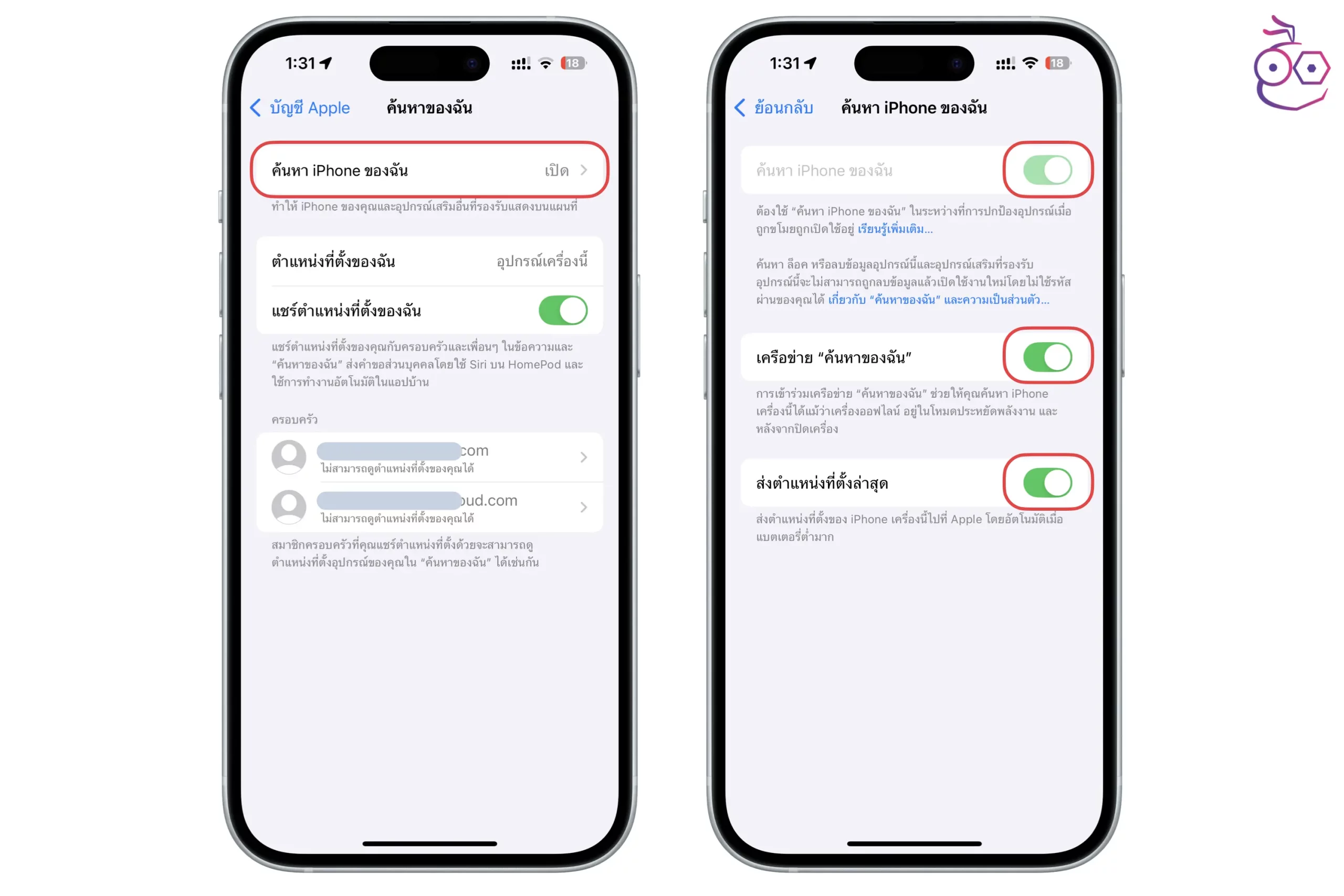 แนะนำให้เปิด เครื่องข่าย “ค้นหาของฉัน” ด้วย เพื่อช่วยให้ค้นหา iPhone ได้แม้ว่าเครื่องออฟไลน์ รวมถึงเปิด ส่งตำแหน่งที่ตั้งล่าสุดไว้ด้วย เพื่อให้ iPhone ส่งตำแหน่งที่ตั้งล่าสุดไปที่ Apple เมื่อพบว่าแบตเหลือน้อย