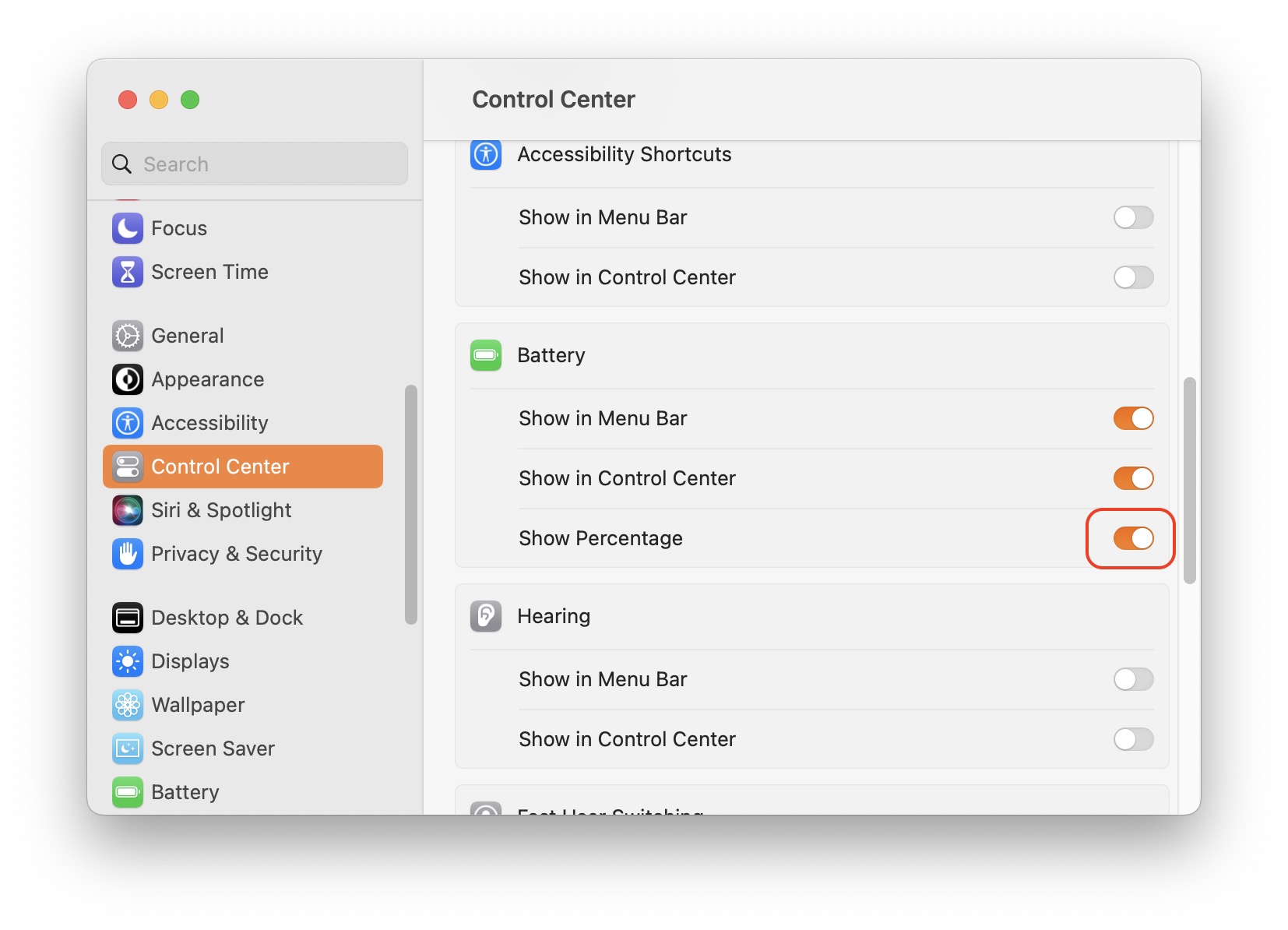 ไปที่ System Setting > คลิกเลือก Control Center ที่เมนูด้านซ้าย > เปิด Show Percentage ในส่วนของ Battery