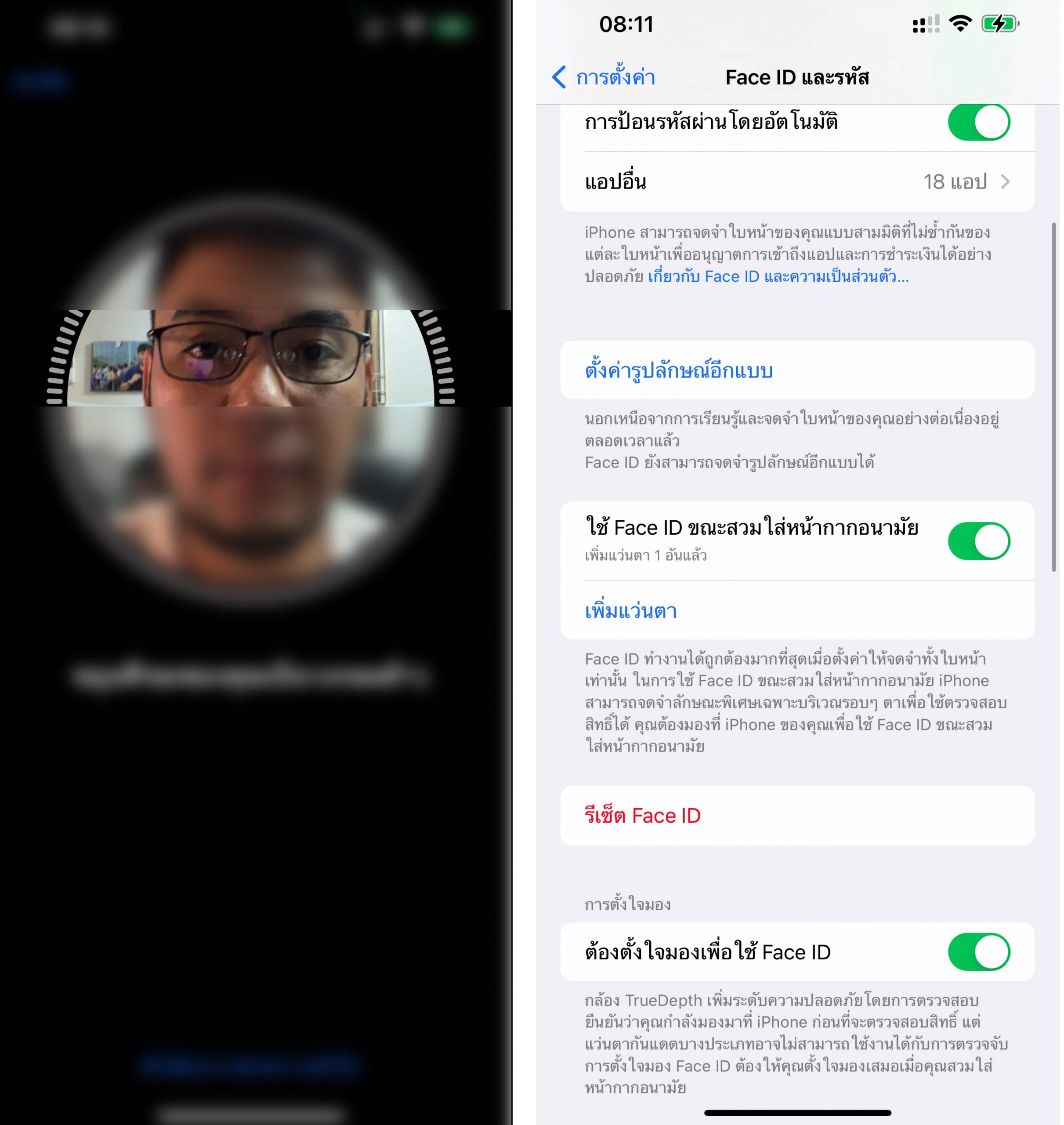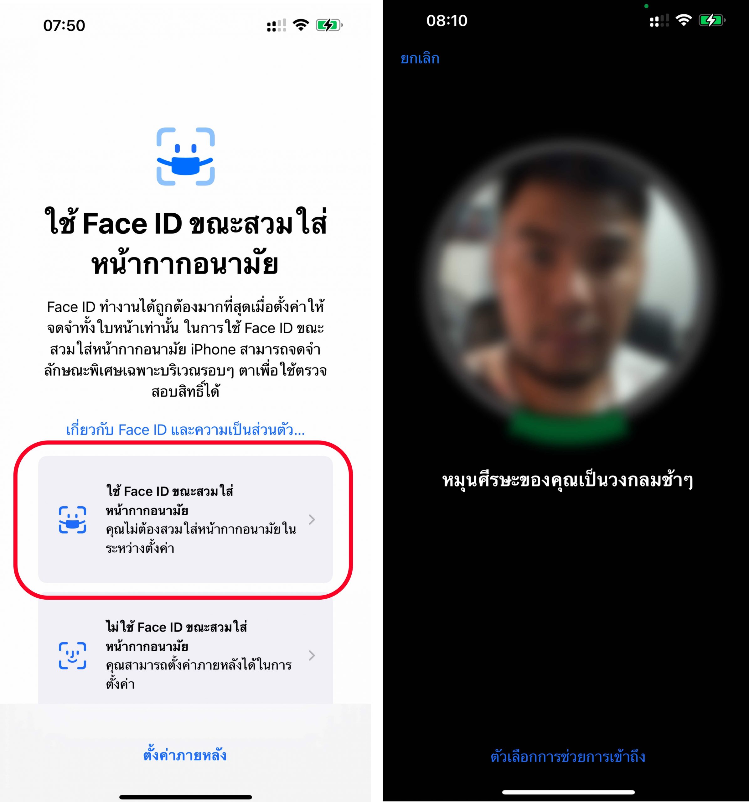 แตะใช้ Face ID ขณะสวมใส่หน้ากากอนามัย > สแกนใบหน้าให้เรียบร้อย