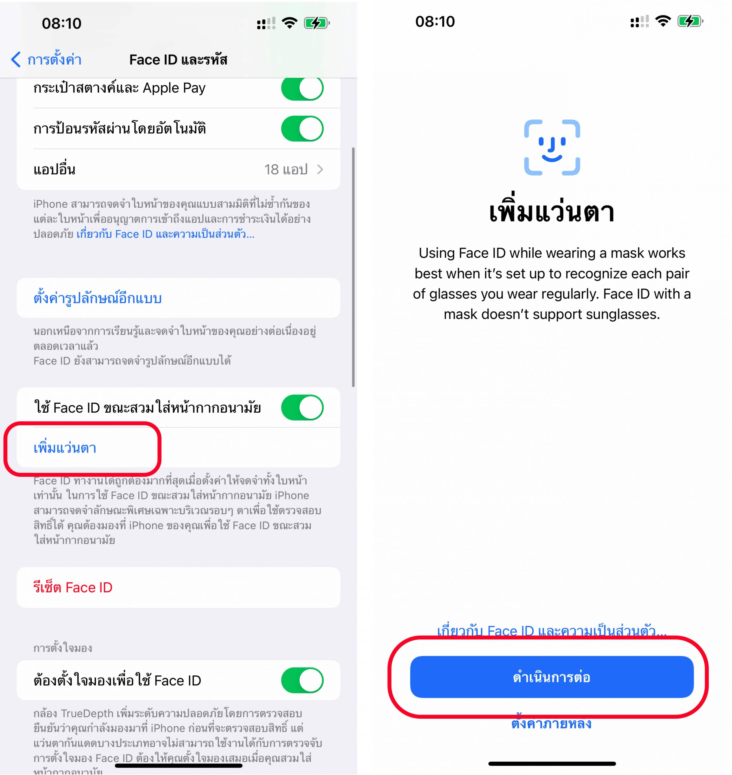 เนื่องจากการใช้ Face ID ขณะสวมใส่หน้ากากอนามัย เป็นการยืนยันตัวตนด้วยพื้นที่รอบ ๆ ดวงตา ดังนั้นใครใส่แว่นใส แว่นสายตา ให้สแกนเพิ่มดังนี้