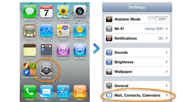 เข้า Settings จากนั้นเลือก Mail, Contacts, Calendars.