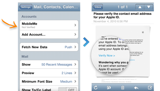 จากนั้นจะพบข้อความใต้ MobileMe ว่า Not Verified คือแอปเปิ้ลจะส่งอีเมลไปหาเราเพื่อทำการยืนยัน ก็ให้เราไปเช็คที่กล่องอีเมลแล้วก็กด Verify Now> ซะให้เรียบร้อย สถานะก็จะกลายเป็น Verified แสดงว่าพร้อมใช้งานแล้ว