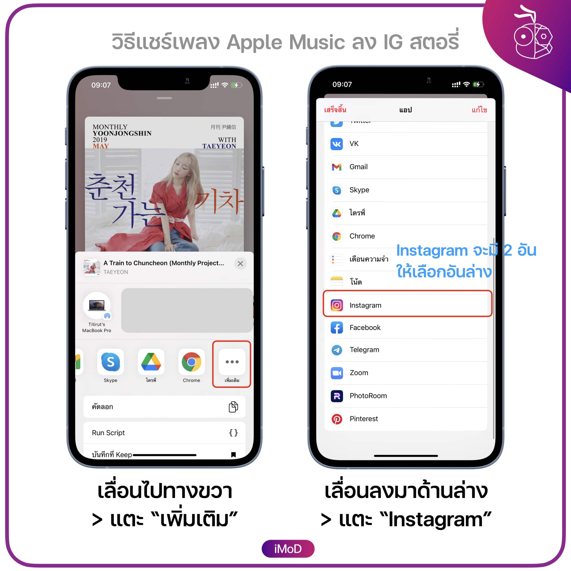 ที่แถบแชร์ เลื่อนไปขวาจุดจนเจอคำว่า เพิ่มเติม > แตะ เพิ่มเติม แล้วเลือก Instagram, ตรงนี้ต้องดูดี ๆ เพราะจะมี Instagram อยู่ 2 อัน ให้เลือก Instagram อันที่อยู่ล่าง ๆ