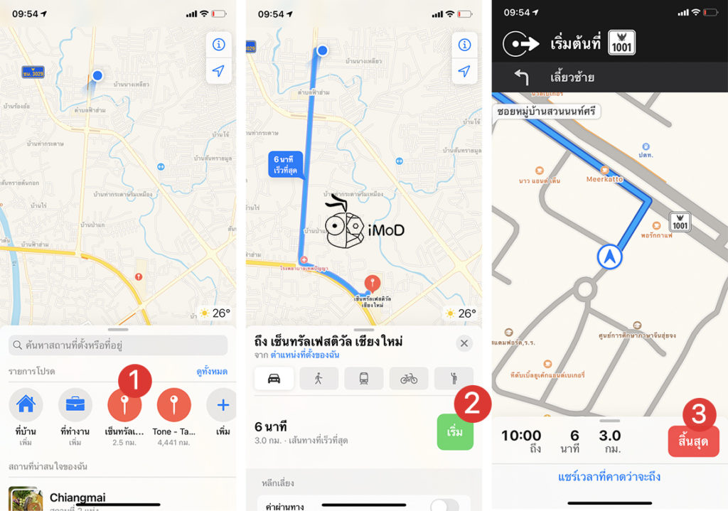 ก่อนอื่นเราจะต้องเริ่มการนำทางบนแผนที่ Apple Maps ไปยังสถานที่ที่เราต้องการจะไปก่อน โดยเข้าไปที่แอป Apple Maps เลือกจุดหมายปลายทายที่ต้องการ แล้วแตะ เริ่ม เพื่อเริ่มนำทาง