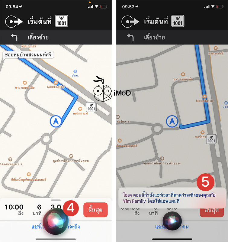 จากนั้นให้เรียก Siri ขึ้น โดยพูดว่า “หวัดดี Siri” หรือกดปุ่มด้านข้างไว้ จนมีไอคอน Siri แสดงขึ้นบนหน้าจอด้านล่าง > เริ่มต้นการแชร์ ETA ด้วยการสั่ง Siri ว่า แชร์เวลาที่คาดว่าจะถึงให้กับ … ซึ่งจะต้องเป็นชื่อผู้ติดต่อที่เราบันทึกไว้ในรายชื่อ (ดังตัวอย่างพูดว่า แชร์เวลาที่คาดว่าจะถึงให้กับ Yim)