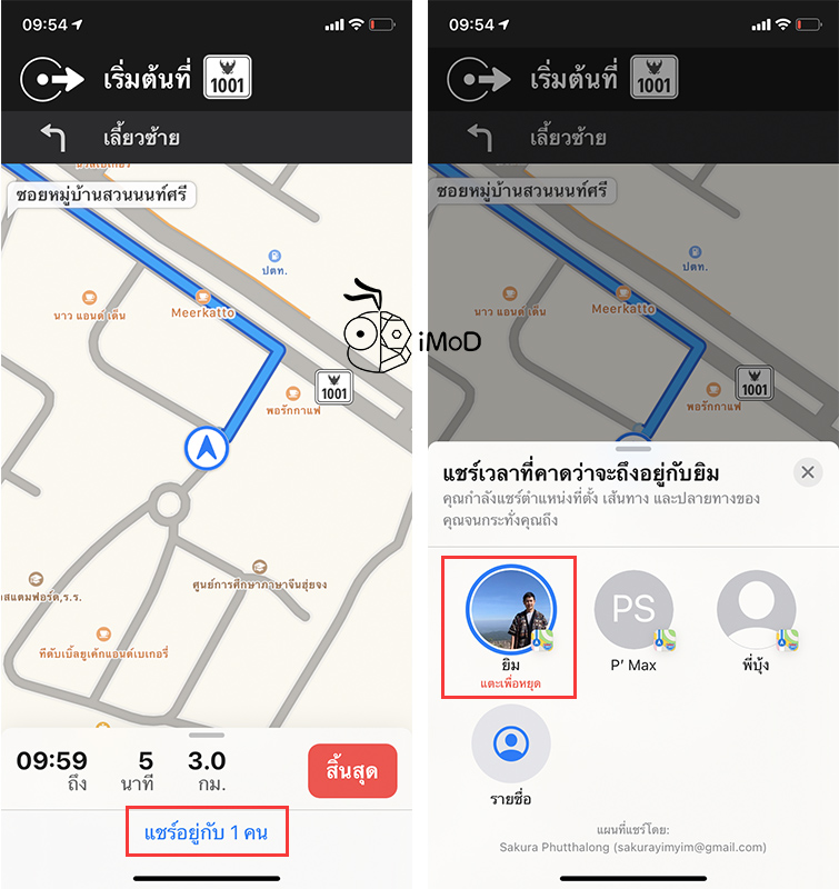 ทางฝั่งผู้แชร์ก็สามารถดูได้ว่าตอนนี้เราแชร์เวลาที่คาดว่าจะถึงกับใครบ้างในแอป Apple Maps ดังรูป