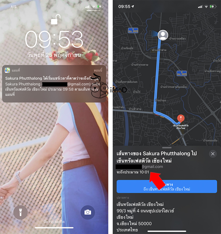 ทางฝั่งผู้รับแชร์ก็จะเห็นการแจ้งเตือนเวลาที่คาดว่าจะถึง (ETA) แจ้งเข้ามา ว่าผู้แชร์จะถึงประมาณกี่โมง ซึ่งเวลาที่แสดงนั้นก็ขึ้นอยู่กับเวลาเดนิทางของผู้แชร์ ฝั่งผู้รับแชร์สามารถแตะการแจ้งเตือนเข้าไปดูการเดินทางได้