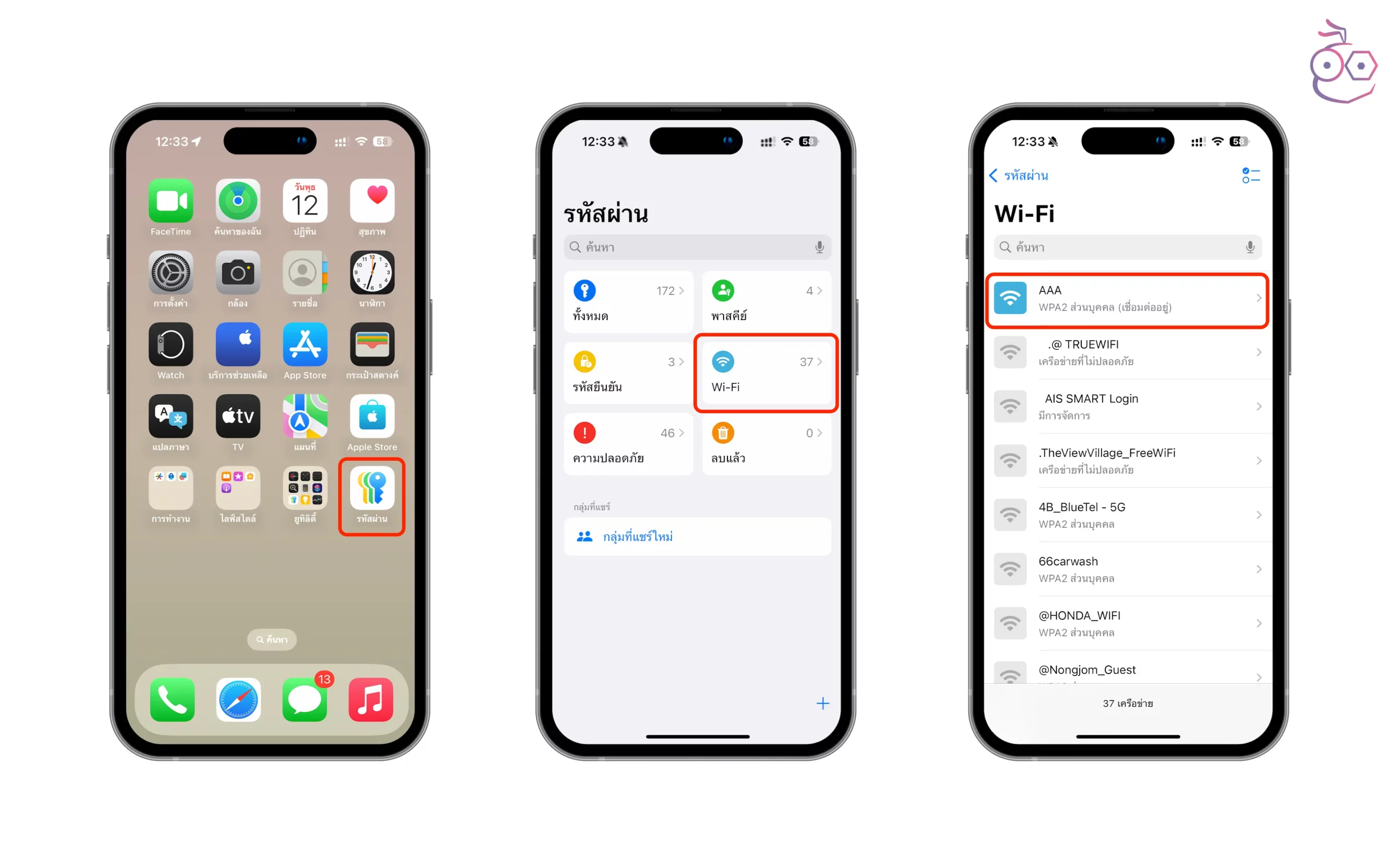 ไปที่แอปรหัสผ่าน (Password) > แตะ Wi-Fi > เลือกเครือข่าย Wi-Fi