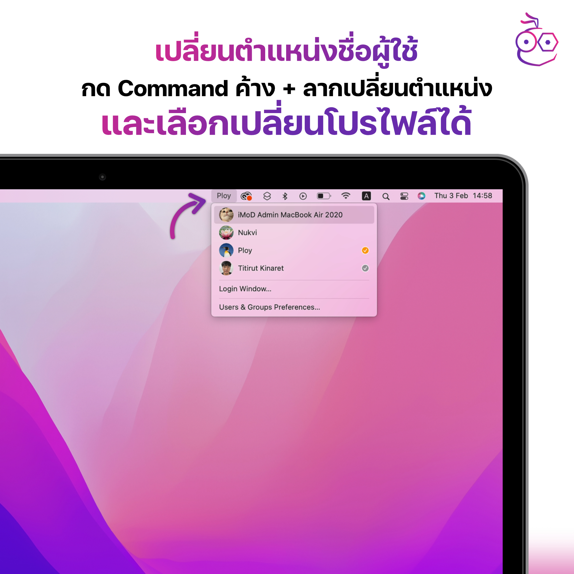 หากต้องการเปลี่ยนตำแหน่งชื่อผู้ใช้ ให้กด Command ค้างไว้แล้วลากชื่อเปลี่ยนตำแหน่งได้เลย