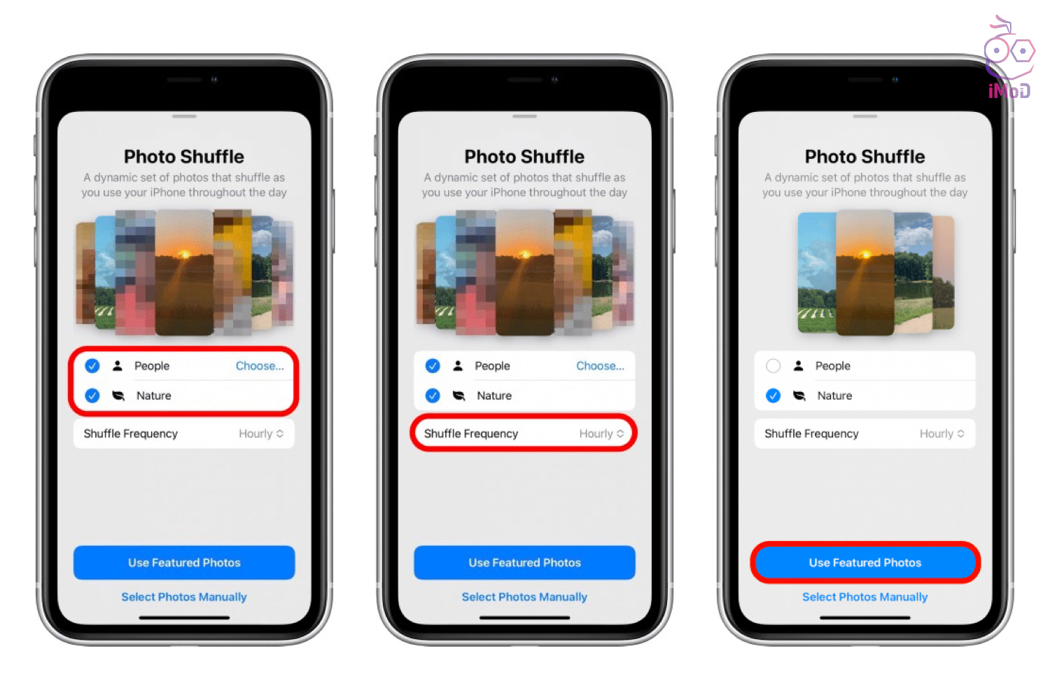 นอกจากนี้ ถ้าหากเราต้องการภาพพื้นหลังจากรูปภาพที่เราถ่ายหรือเก็บไว้ในแอปรูปภาพ (Photos) ก็สามารถเลือก Use Featured Photos เพื่อให้เครื่องประมวลผลรูปภาพจากคอลเลคชันรูปภาพอัจฉริยะมาให้อัตโนมัติ เช่น ผู้คน สัตว์เลี้ยง ธรรมชาติ เมือง เป็นต้น แต่วิธีนี้อาจจะต้องรอให้เครื่องประมวลผลจัดคอลเลคชันรูปภาพก่อน ซึ่งใช้เวลานานพอสมควร