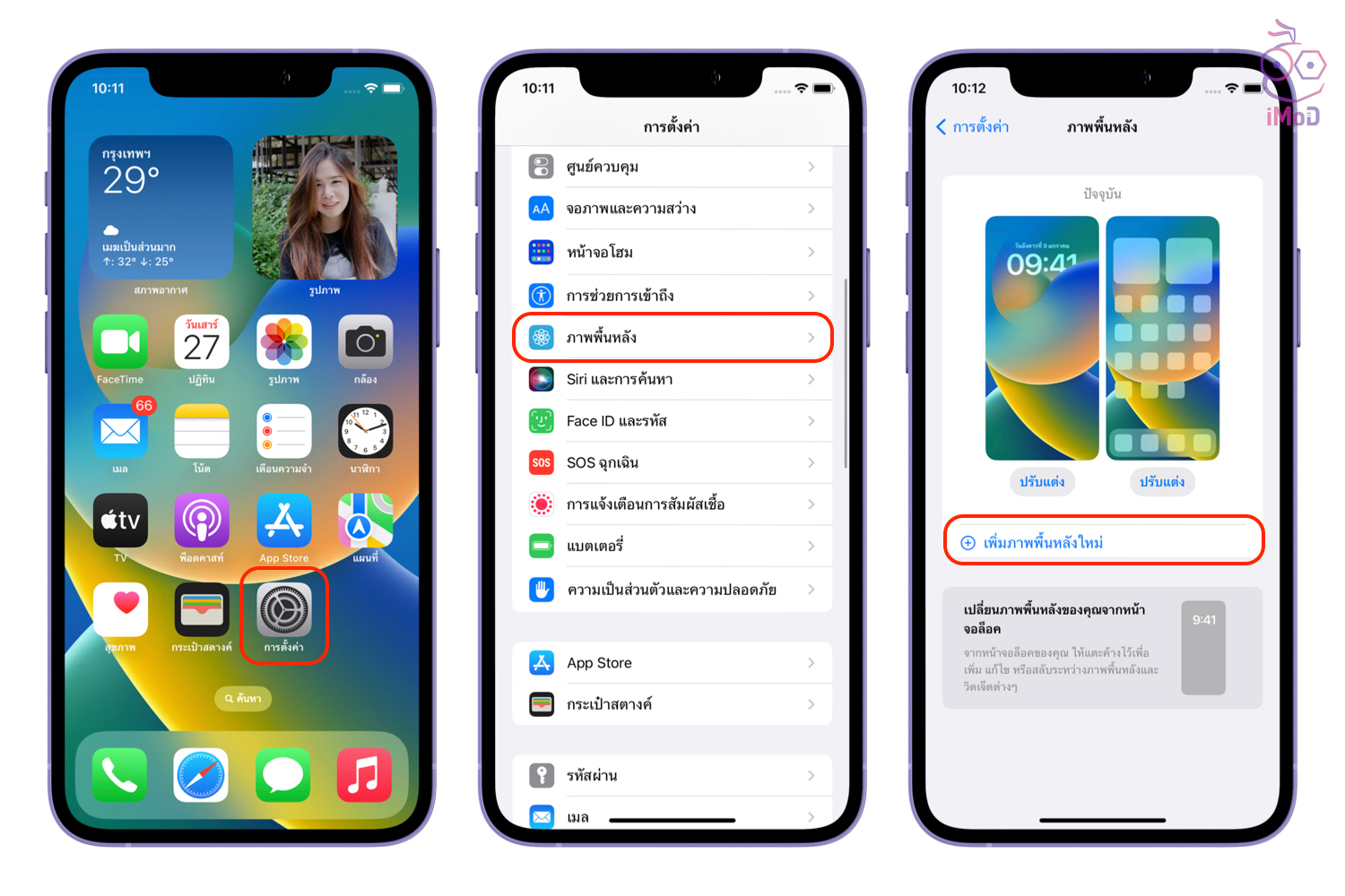 ไปที่ การตั้งค่า (Settings) > ภาพพื้นหลัง (Wallpaper) > เพิ่มภาพพื้นหลังใหม่ (Add New Wallpaper)